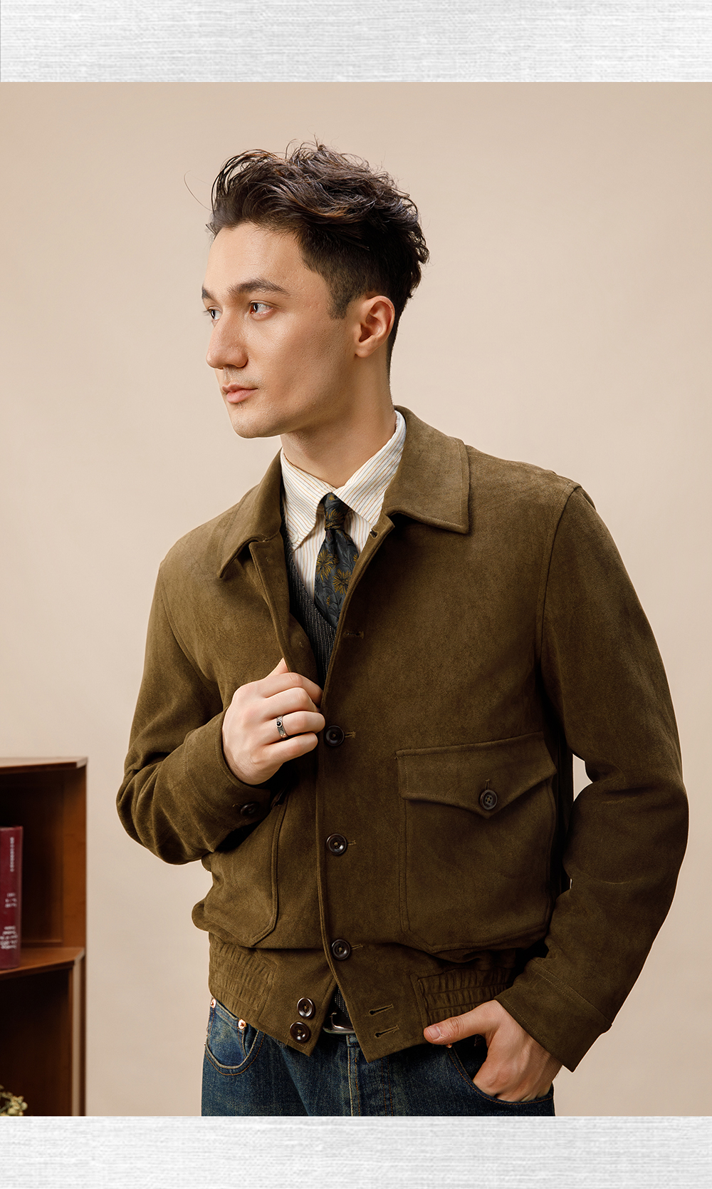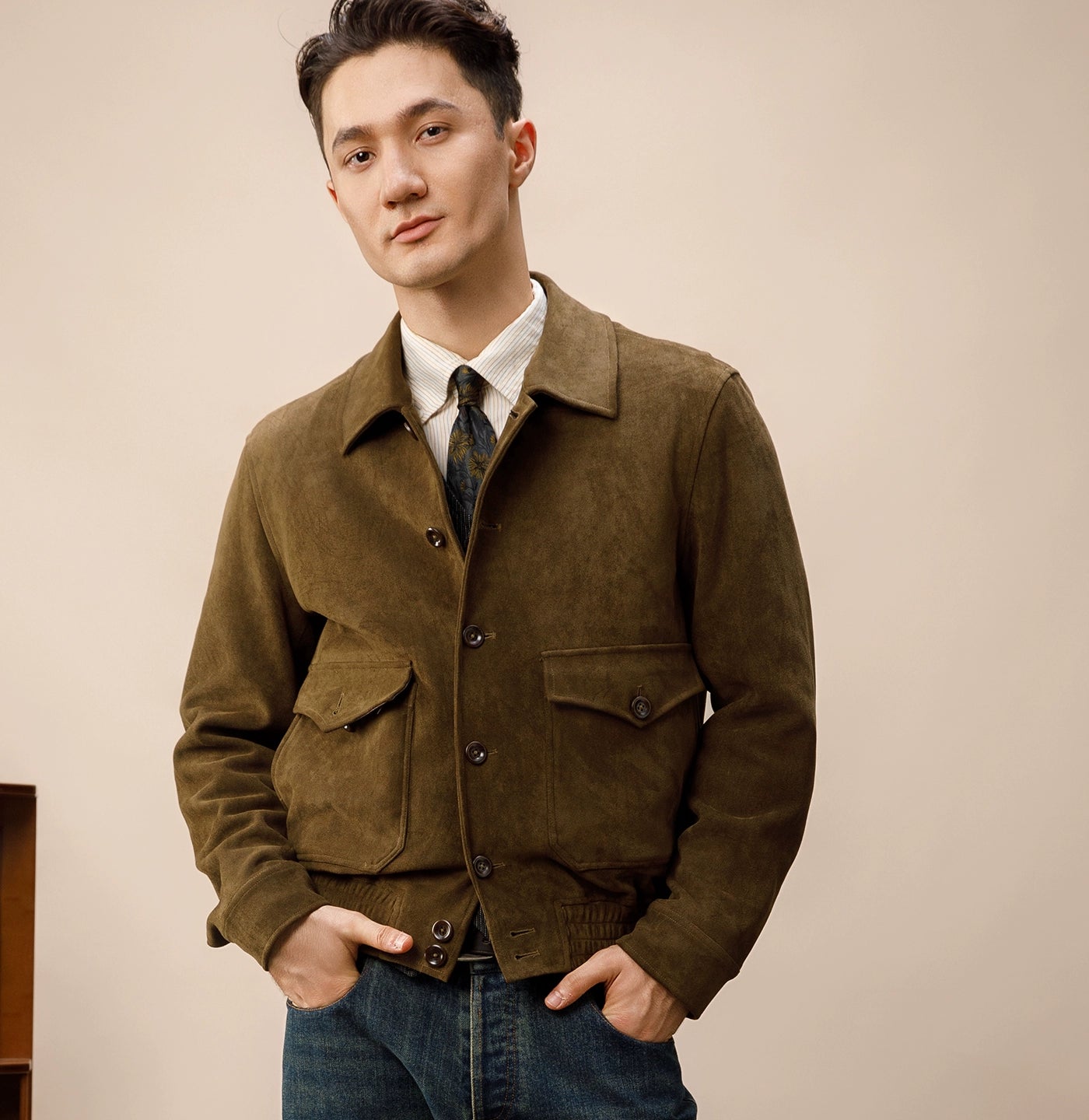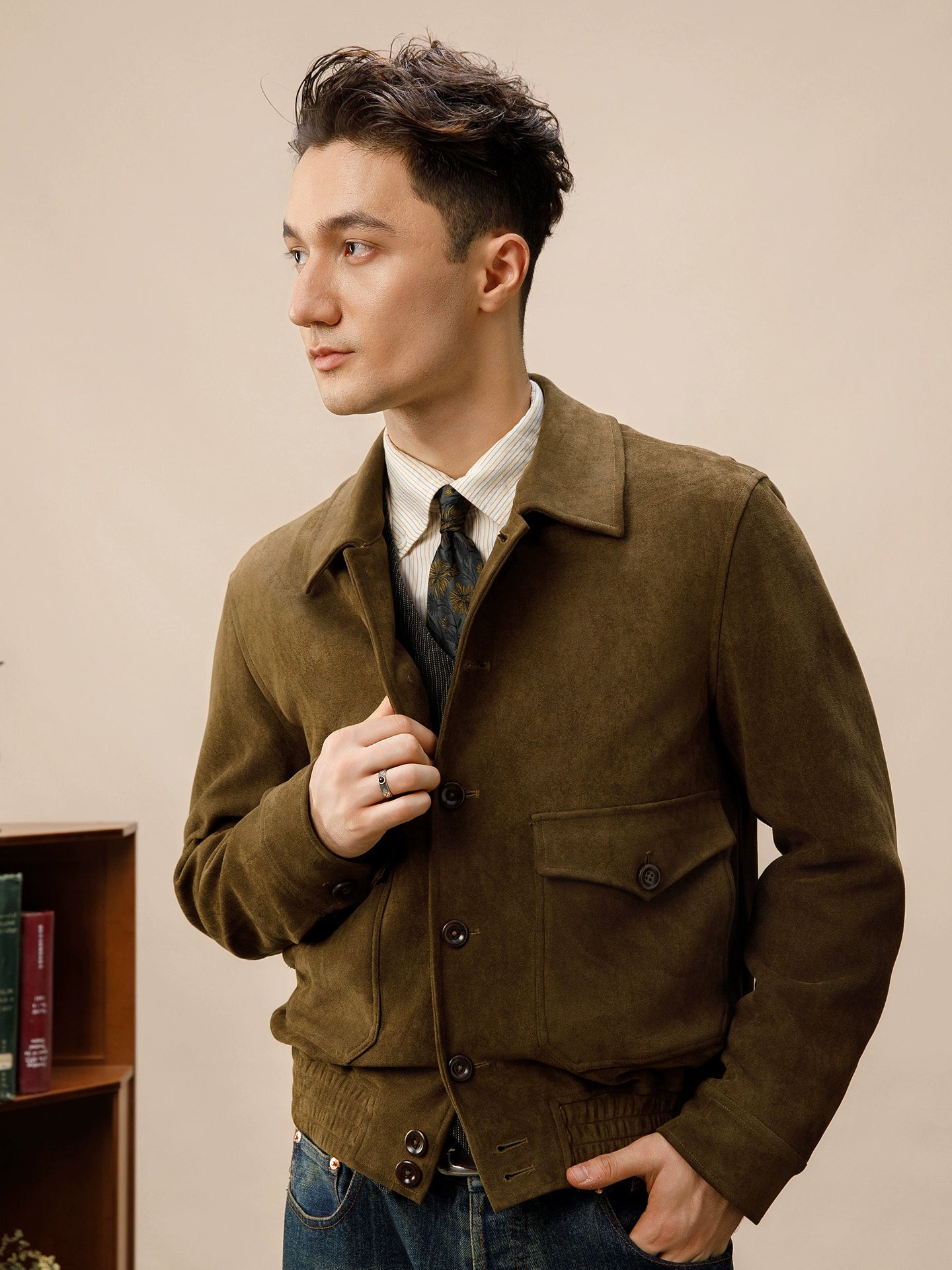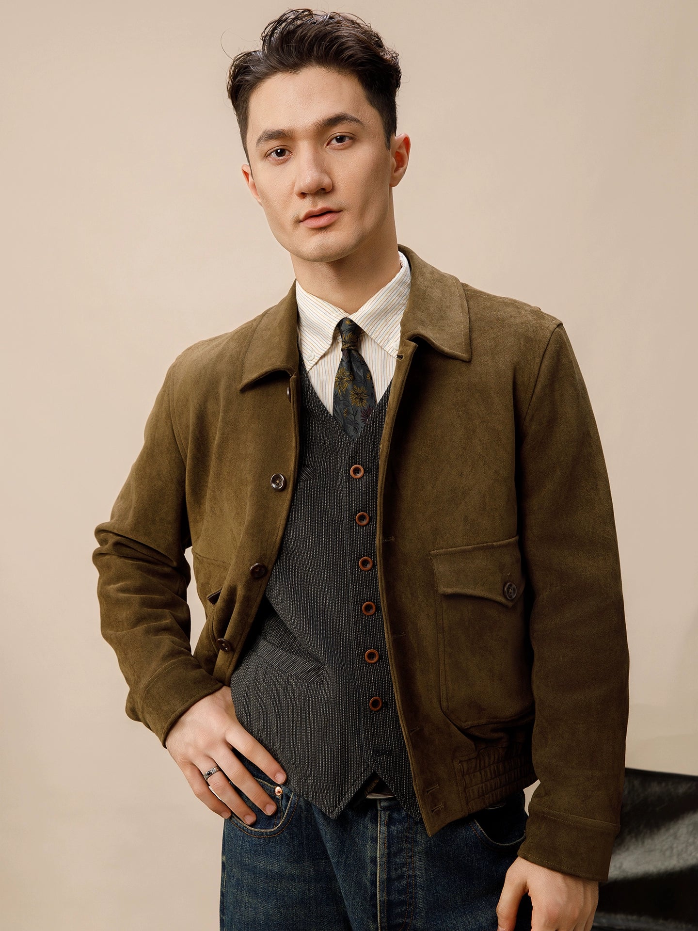 SOARIN复古美式工装鹿皮绒短款夹克男绅士休闲宽松翻领飞行员外套
