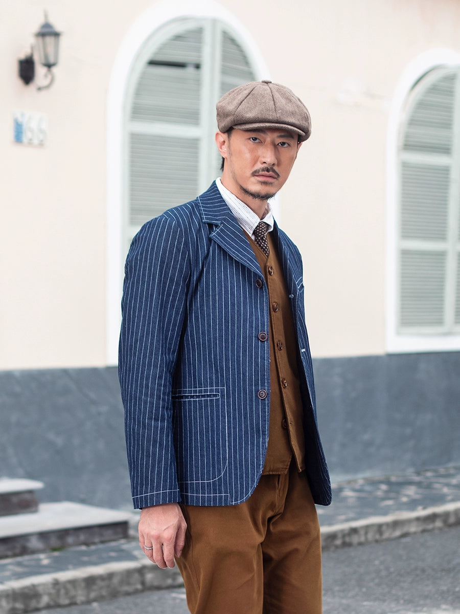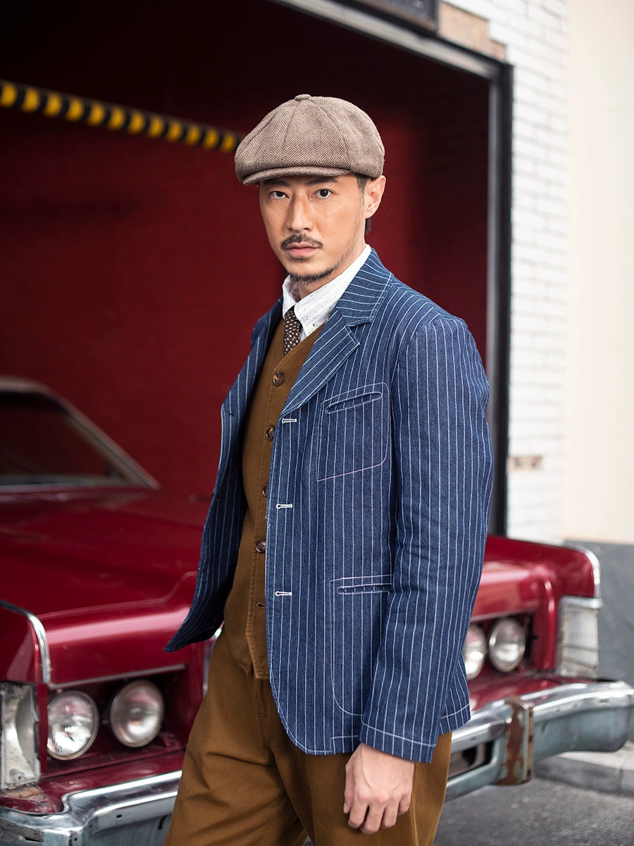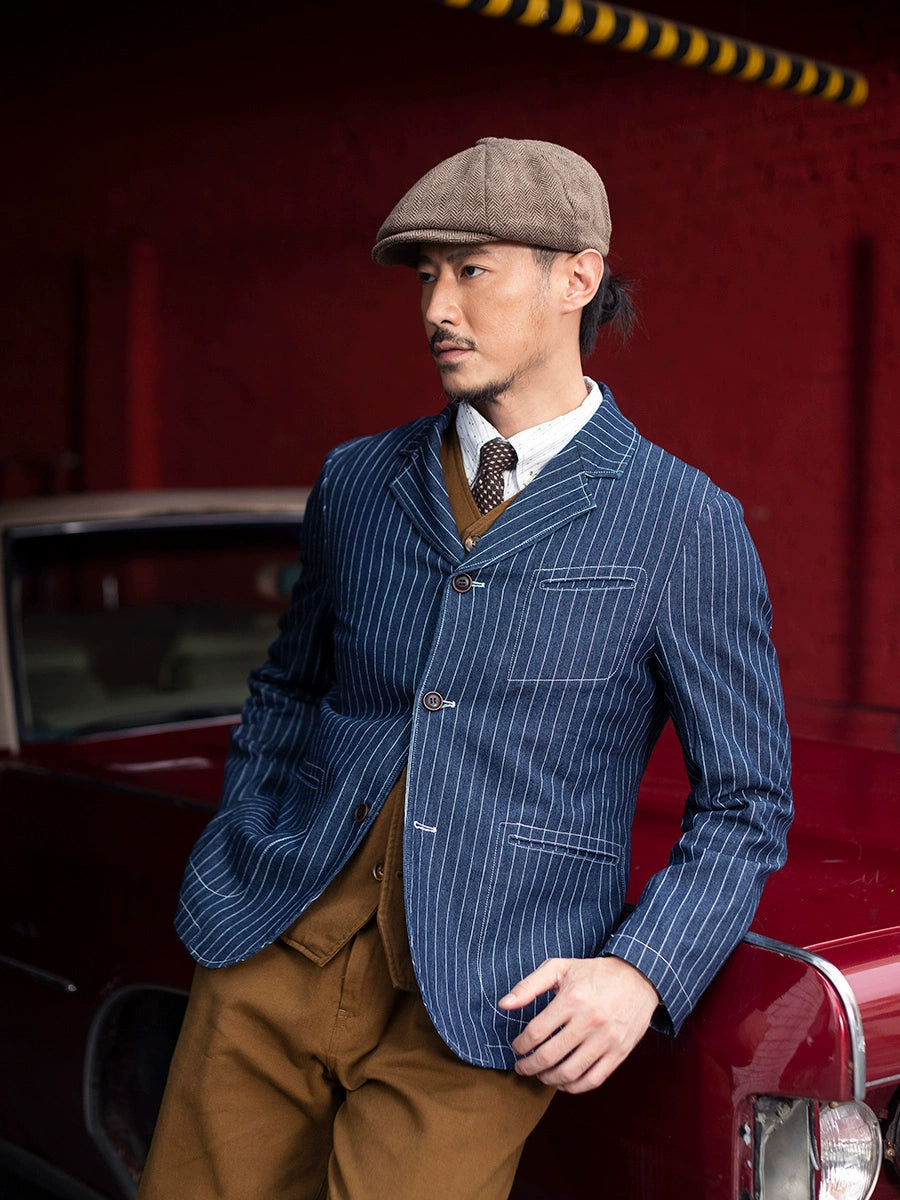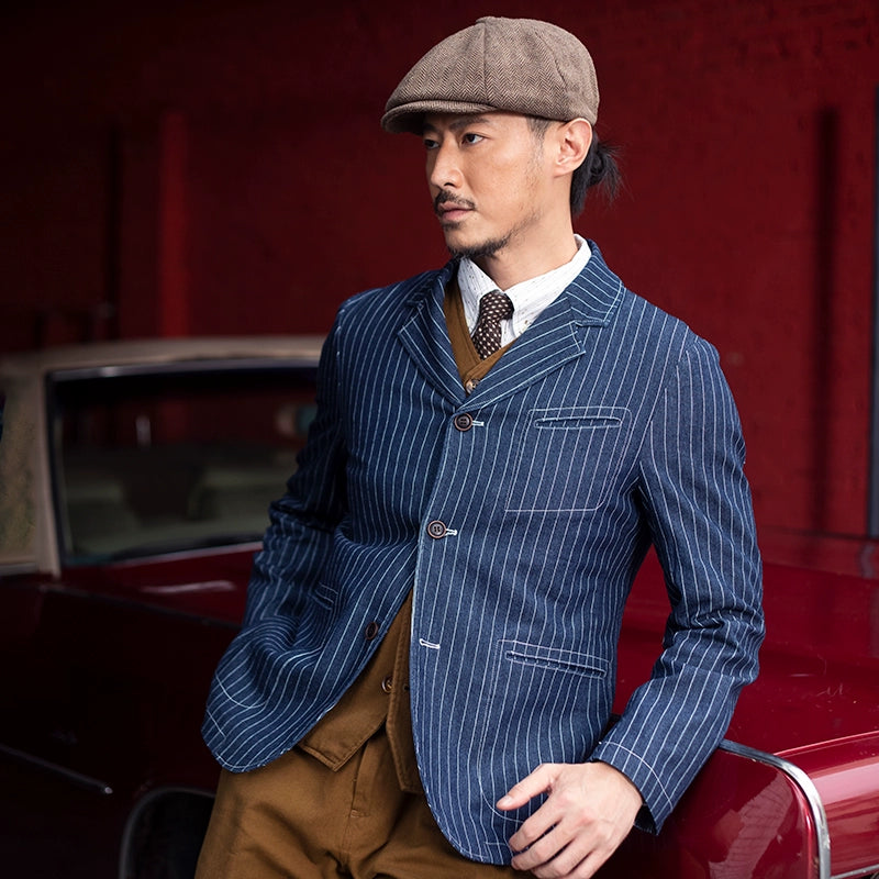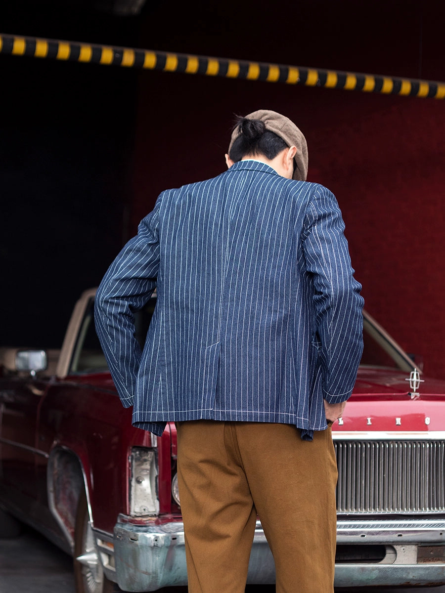 SOARIN美式复古条纹西装外套男 秋冬商务正装休闲牛仔单西服上衣