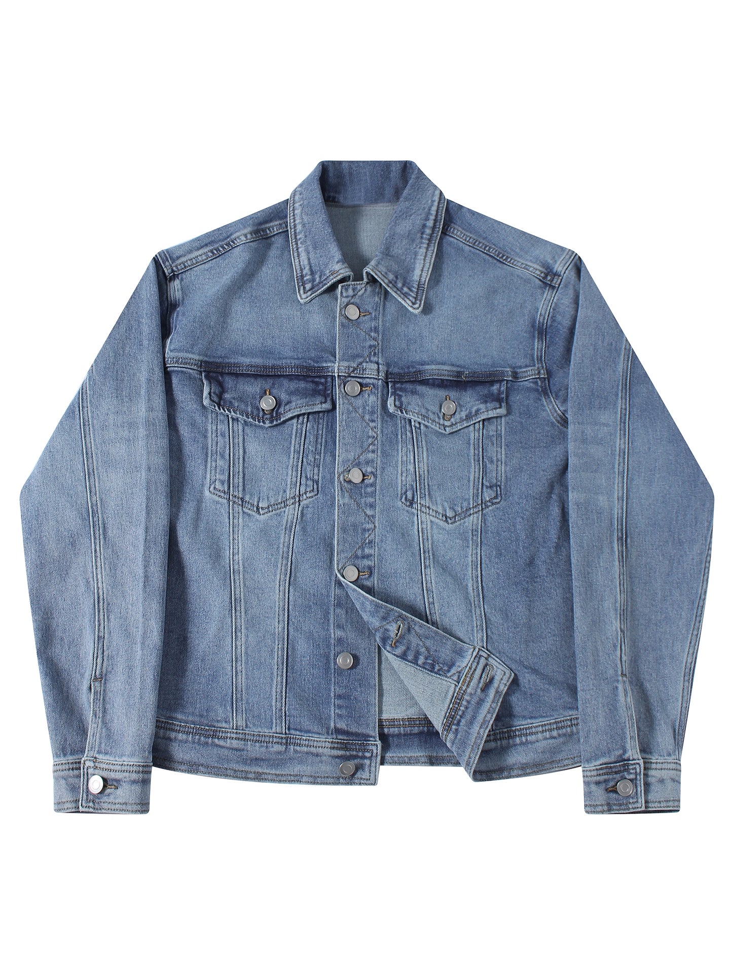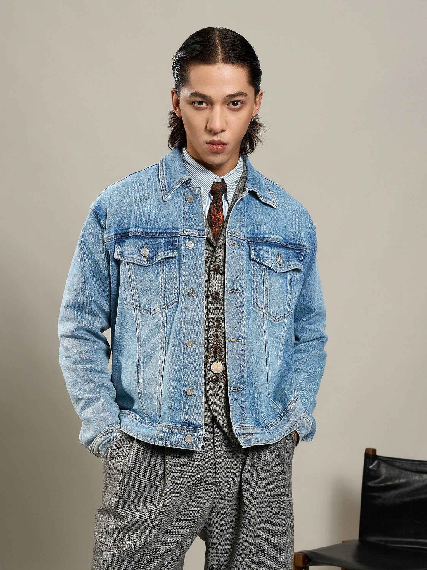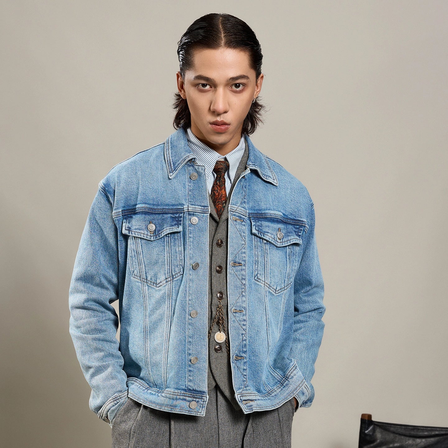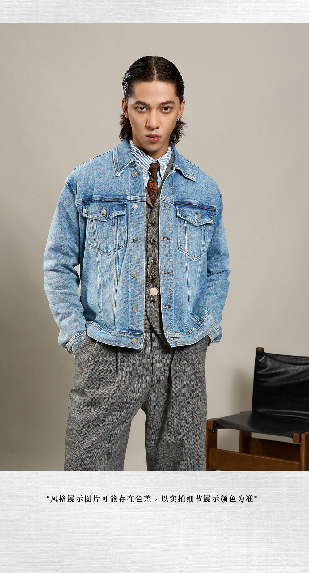 SOARIN美式复古重磅水洗牛仔夹克男 翻领双口袋做旧感工装外套