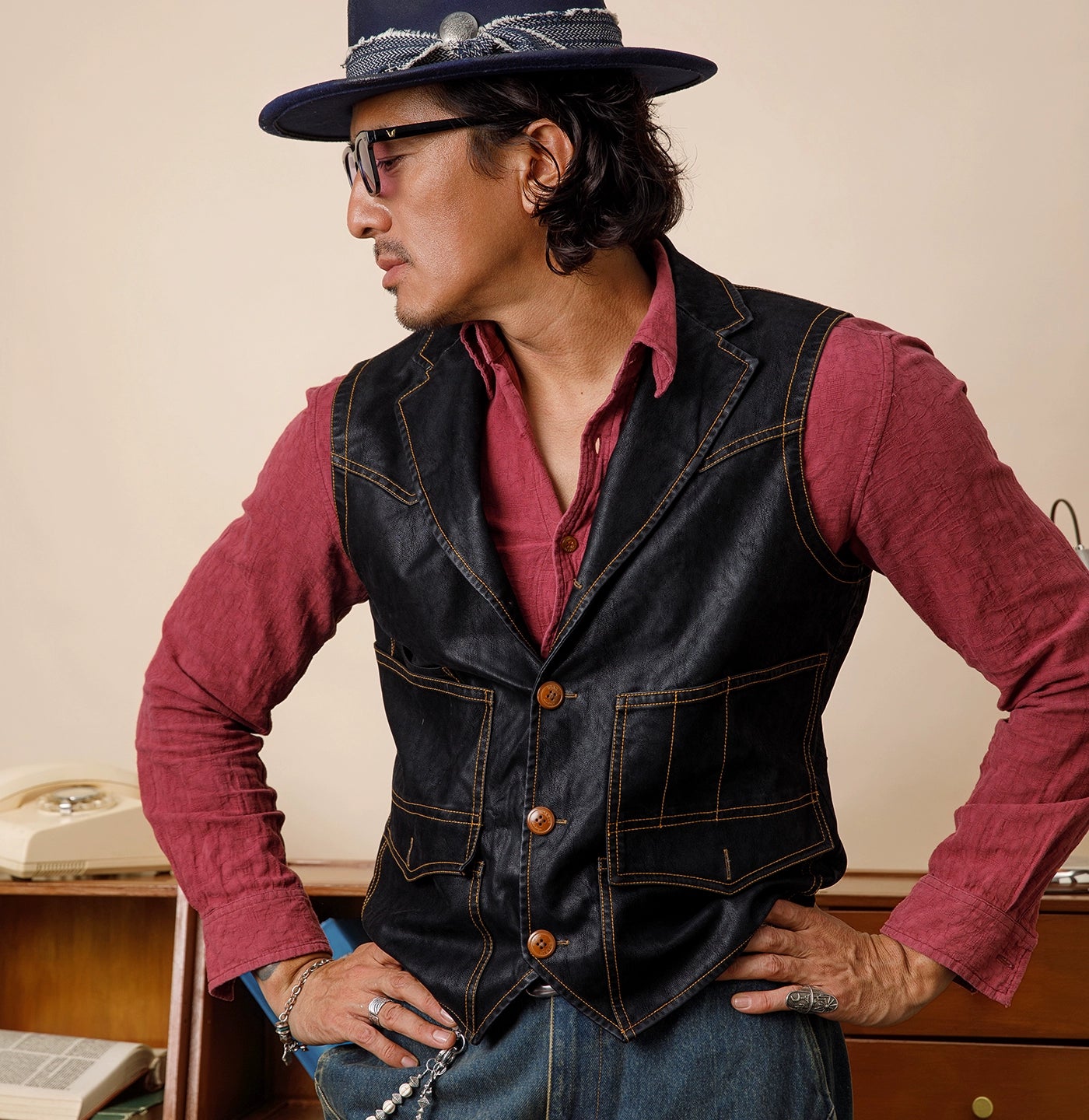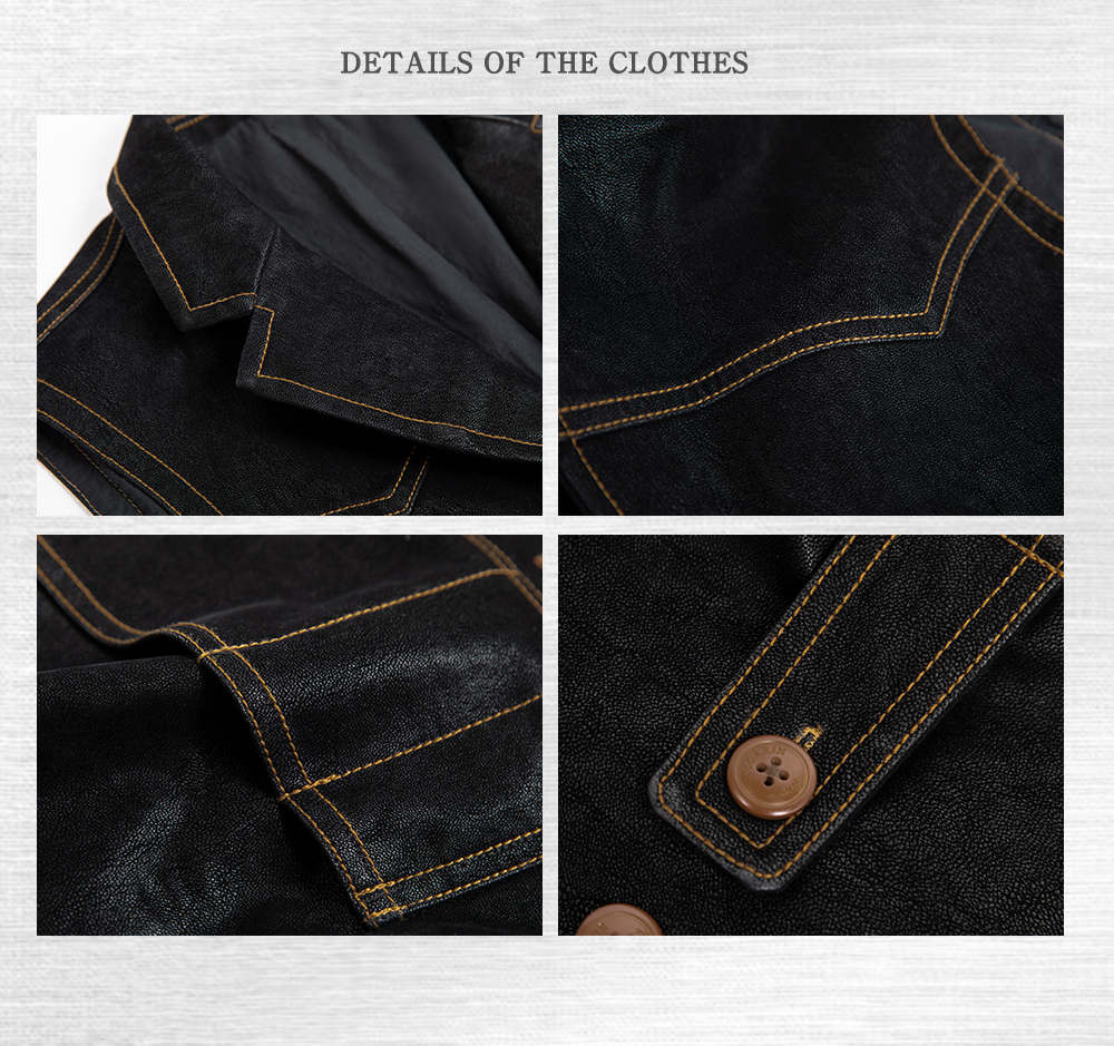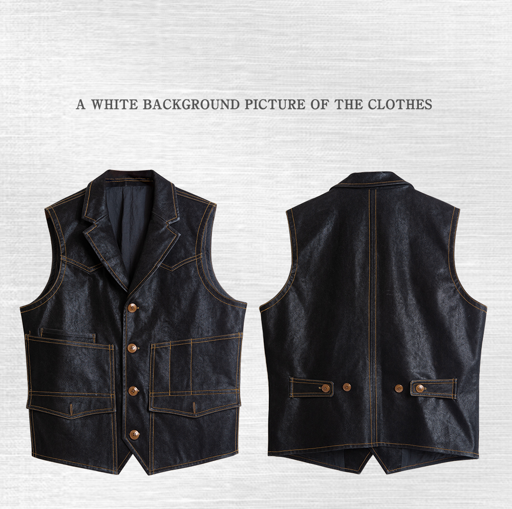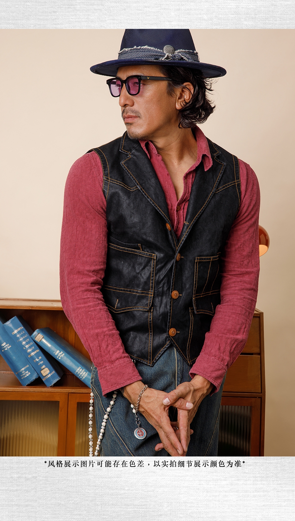 SOARIN美式复古黑色皮衣马甲男 辑明线翻领休闲工装机车马夹背心