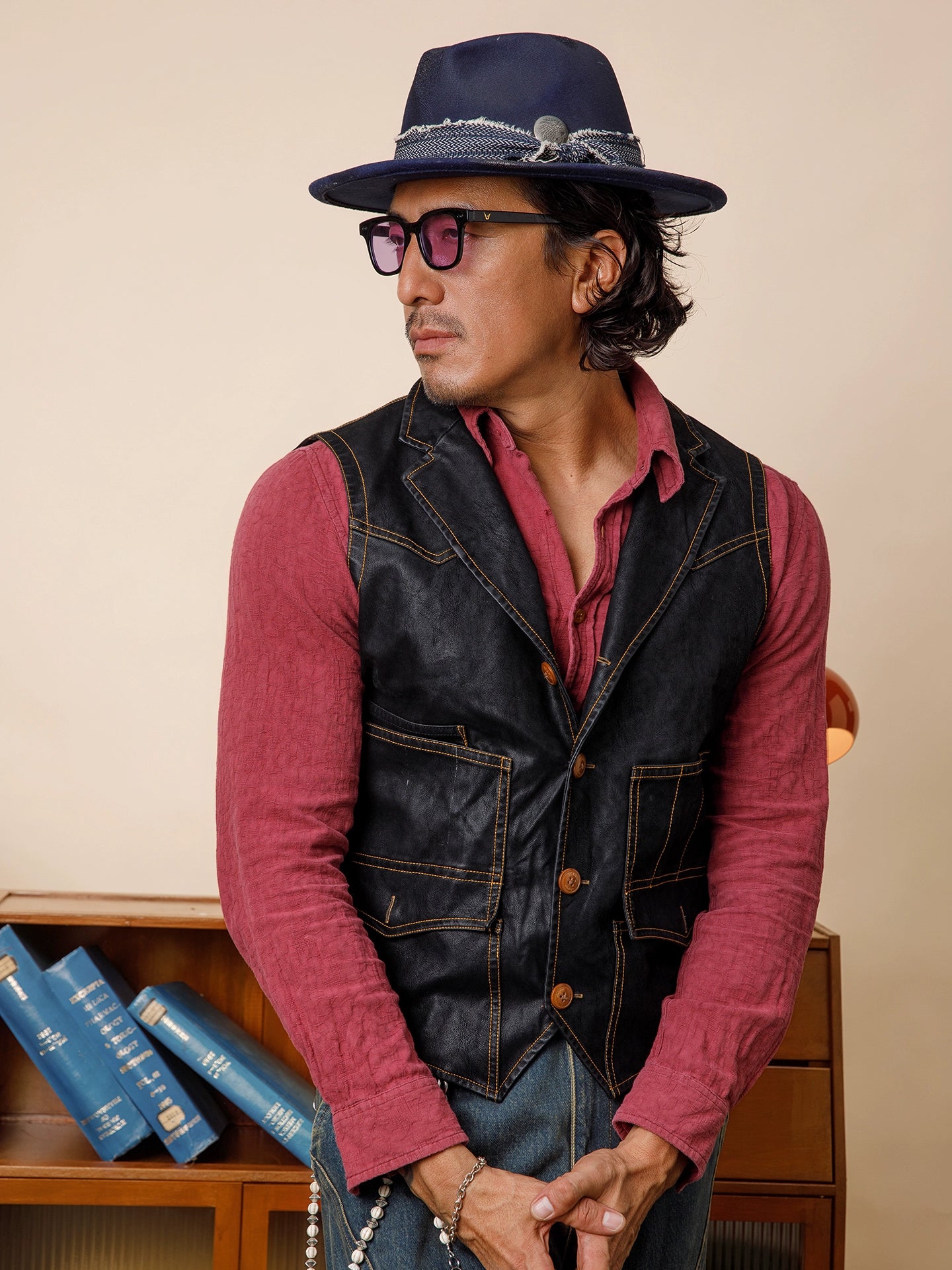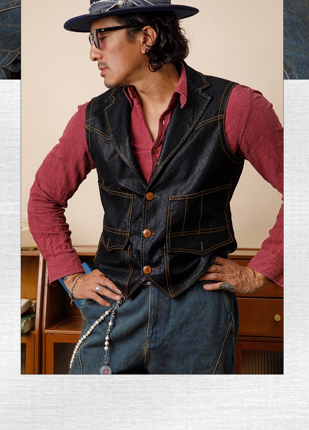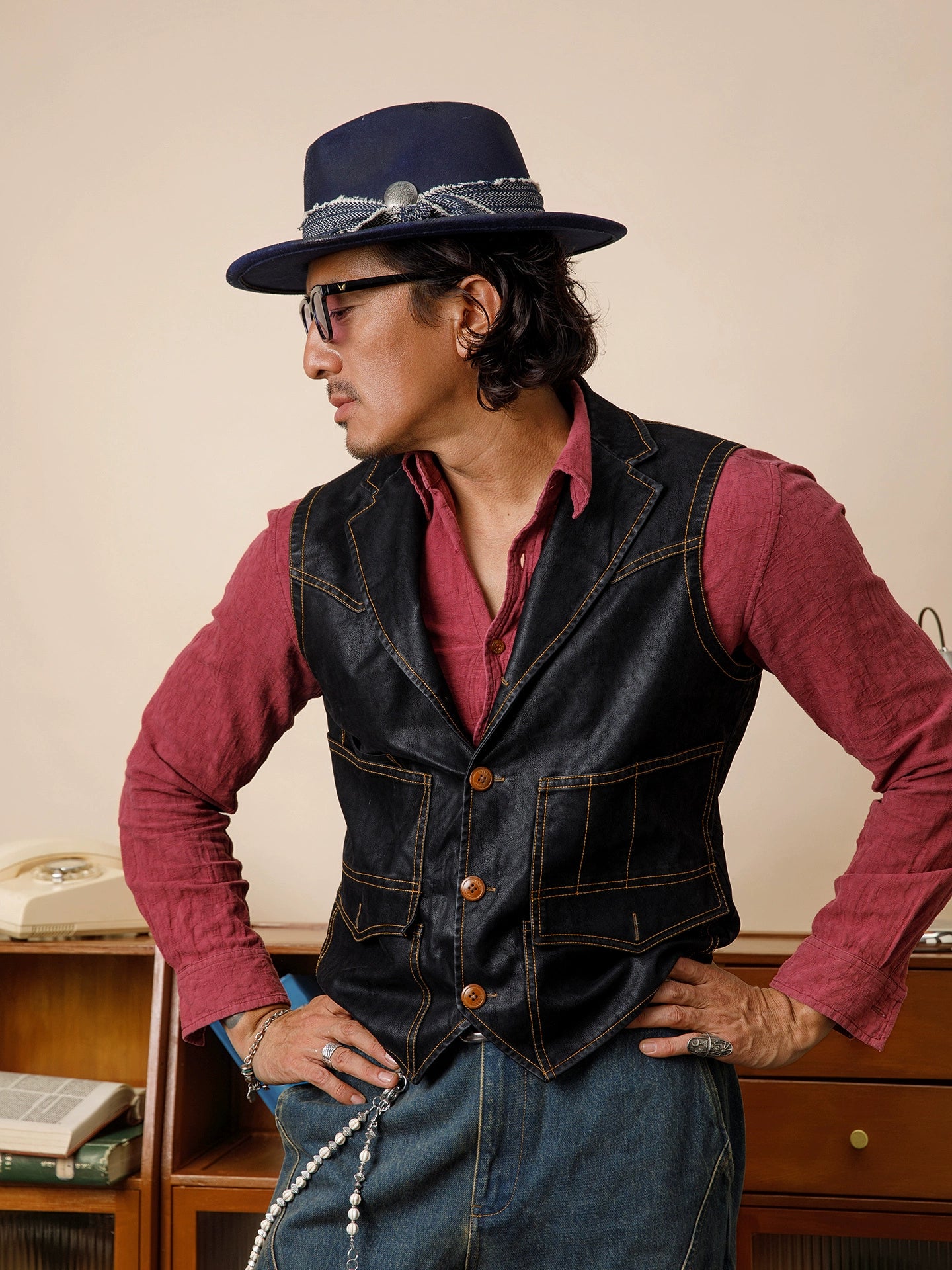 SOARIN美式复古黑色皮衣马甲男 辑明线翻领休闲工装机车马夹背心