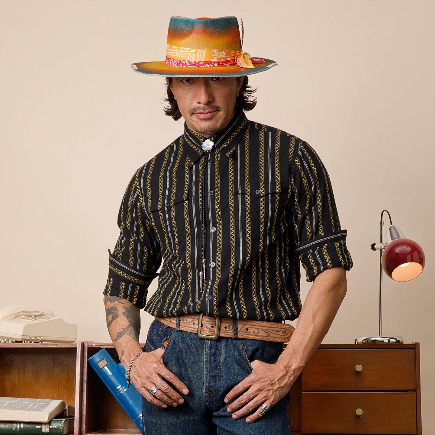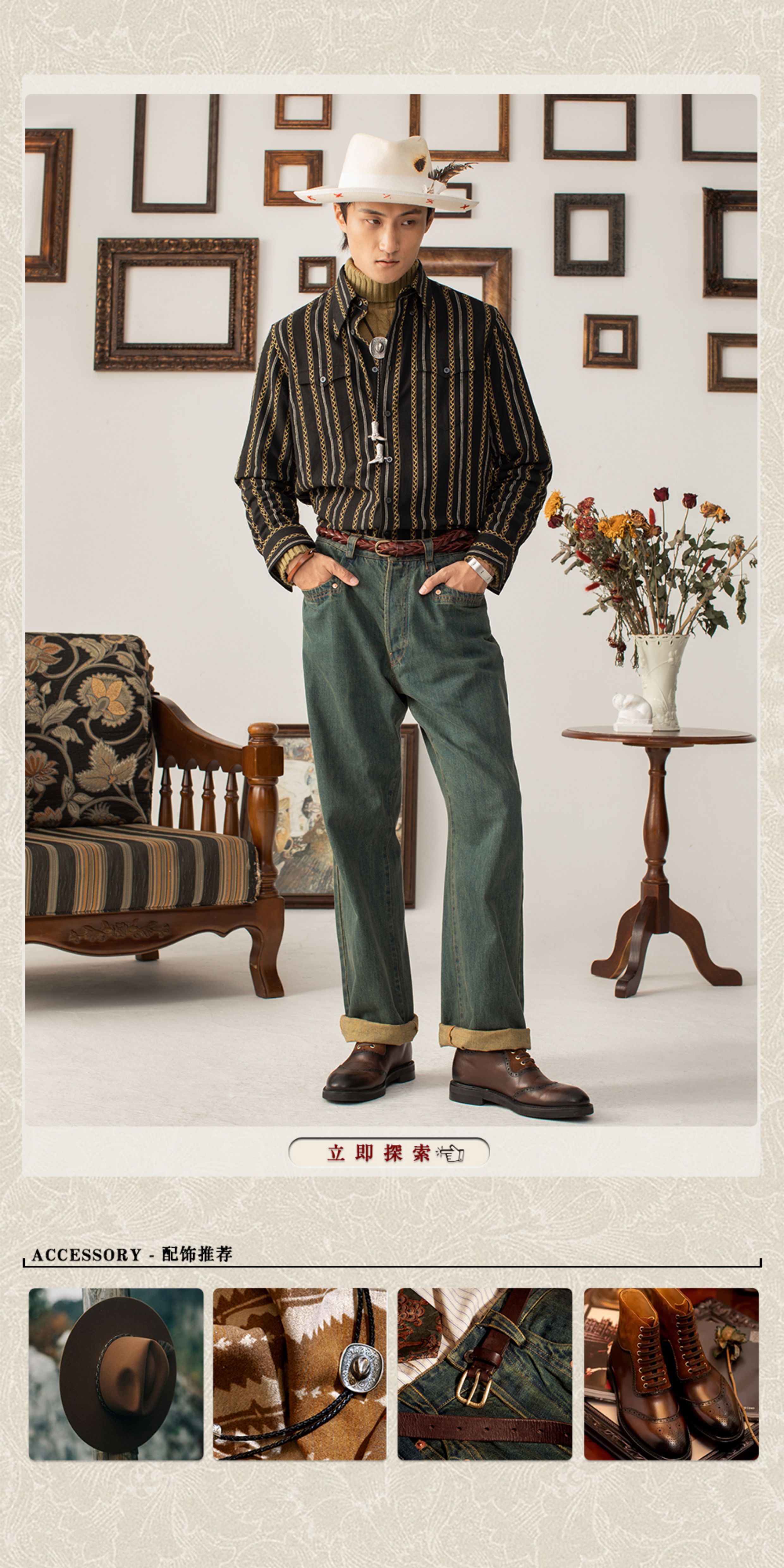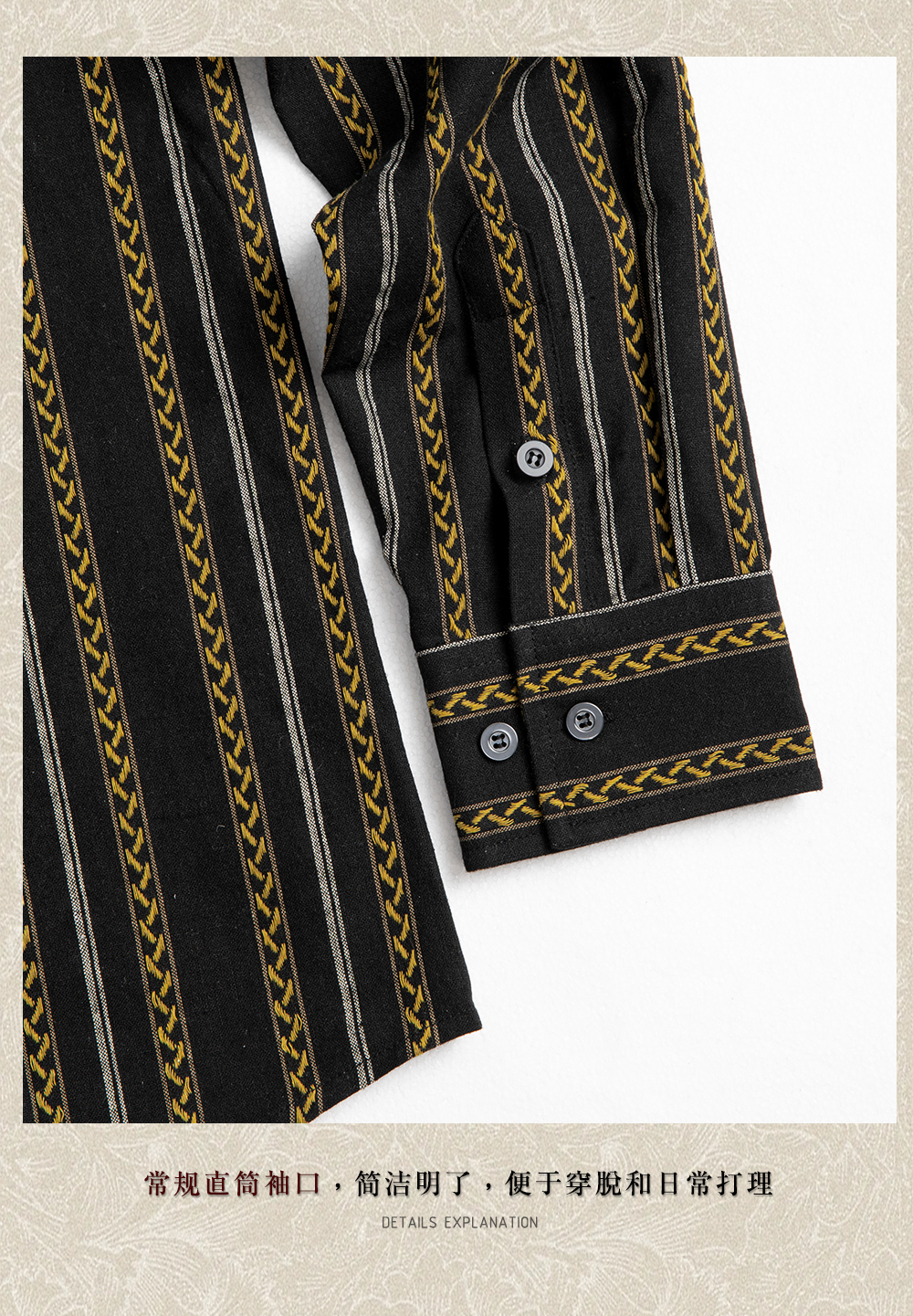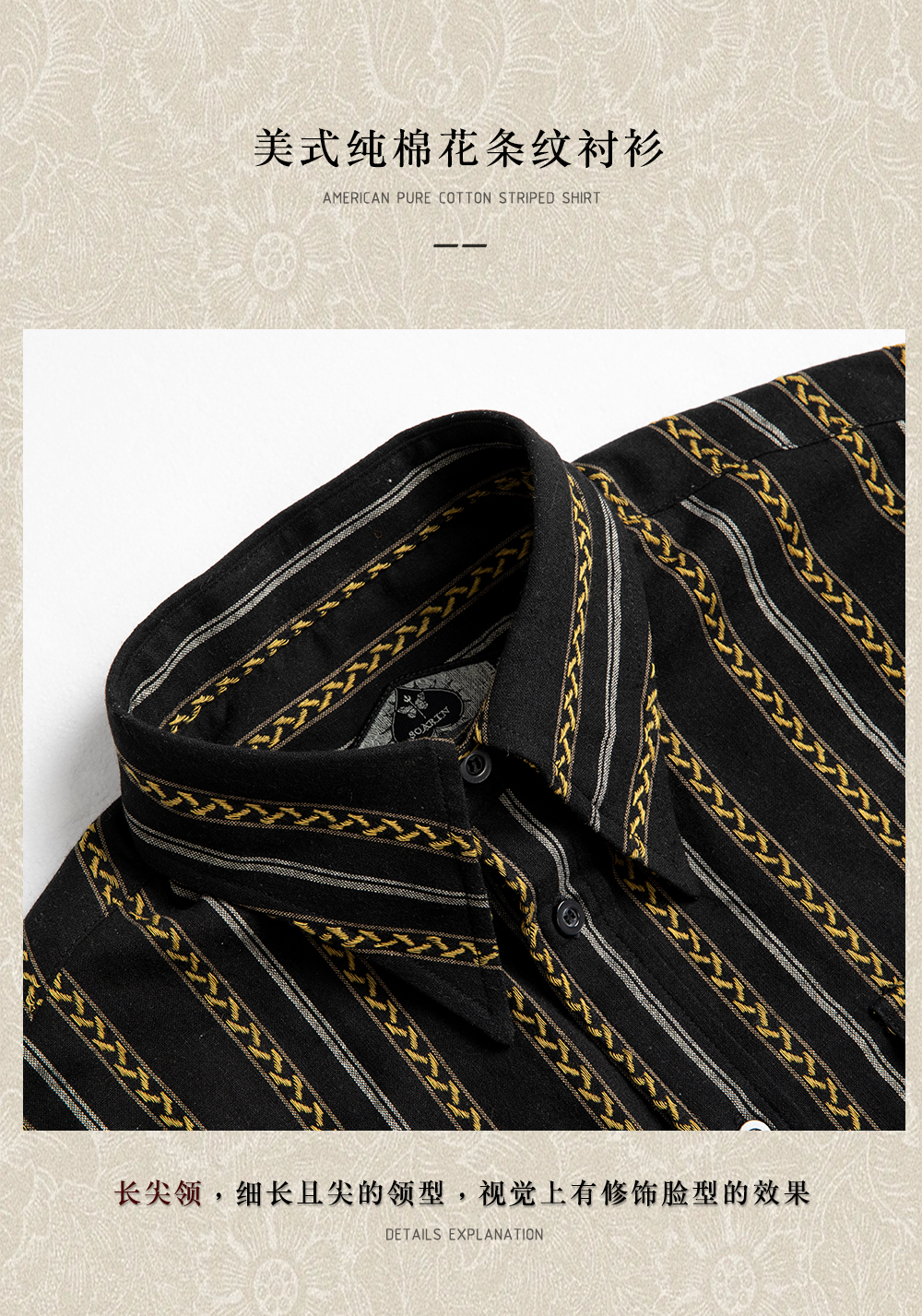 SOARIN美式西部牛仔风黑色条纹长袖衬衫男 全棉休闲提花工装衬衣