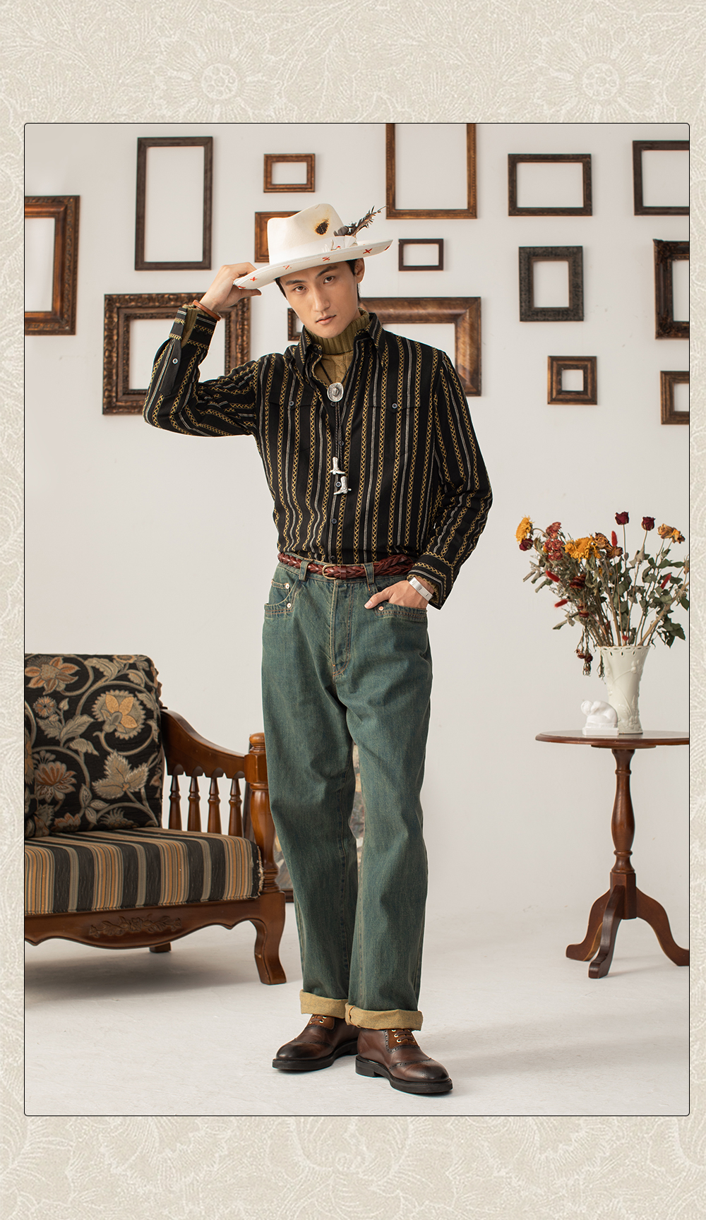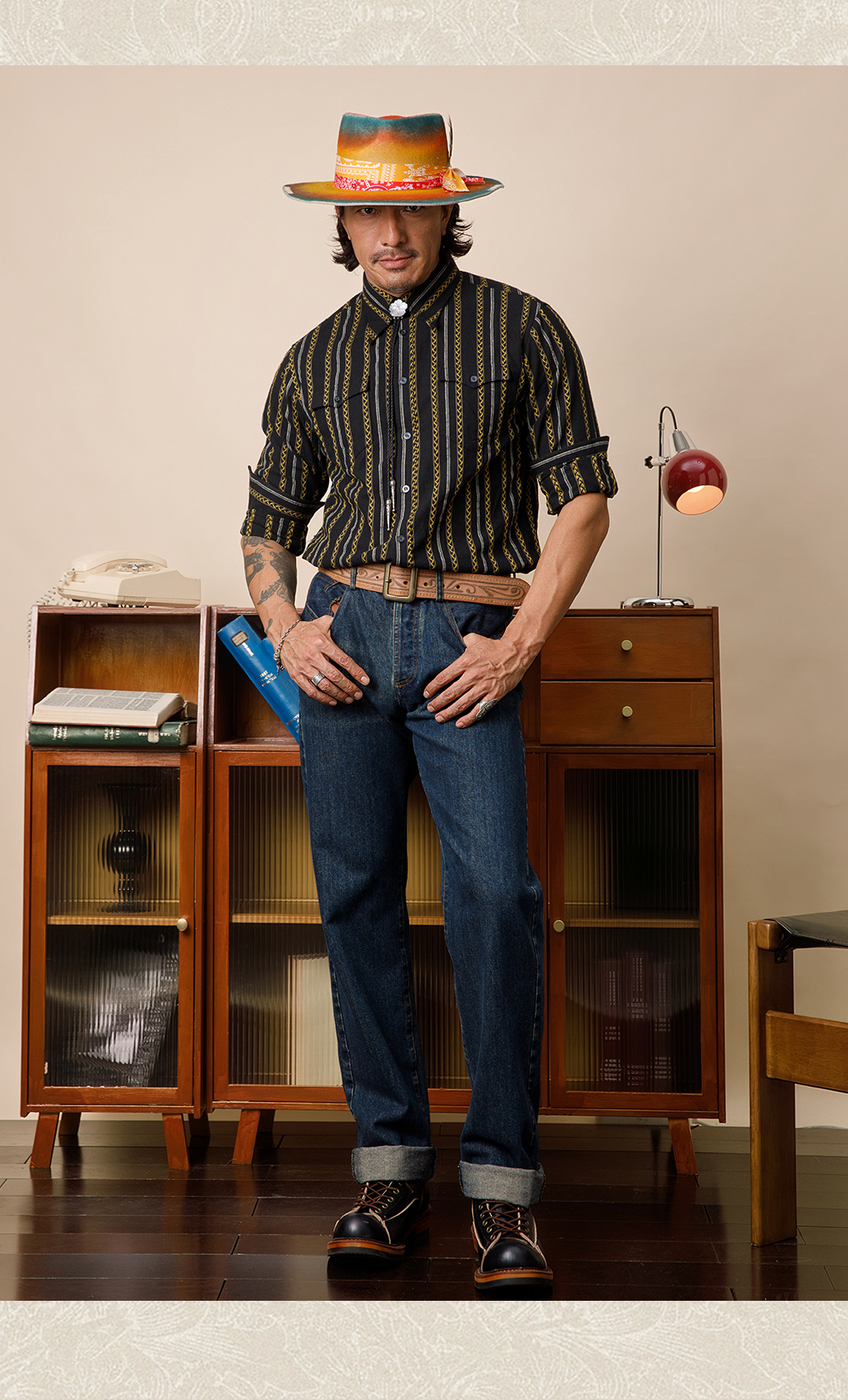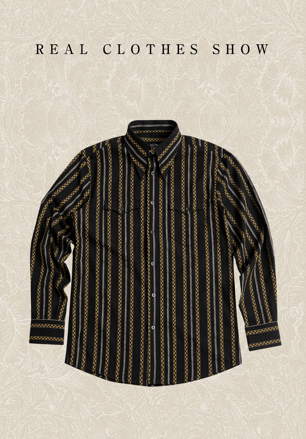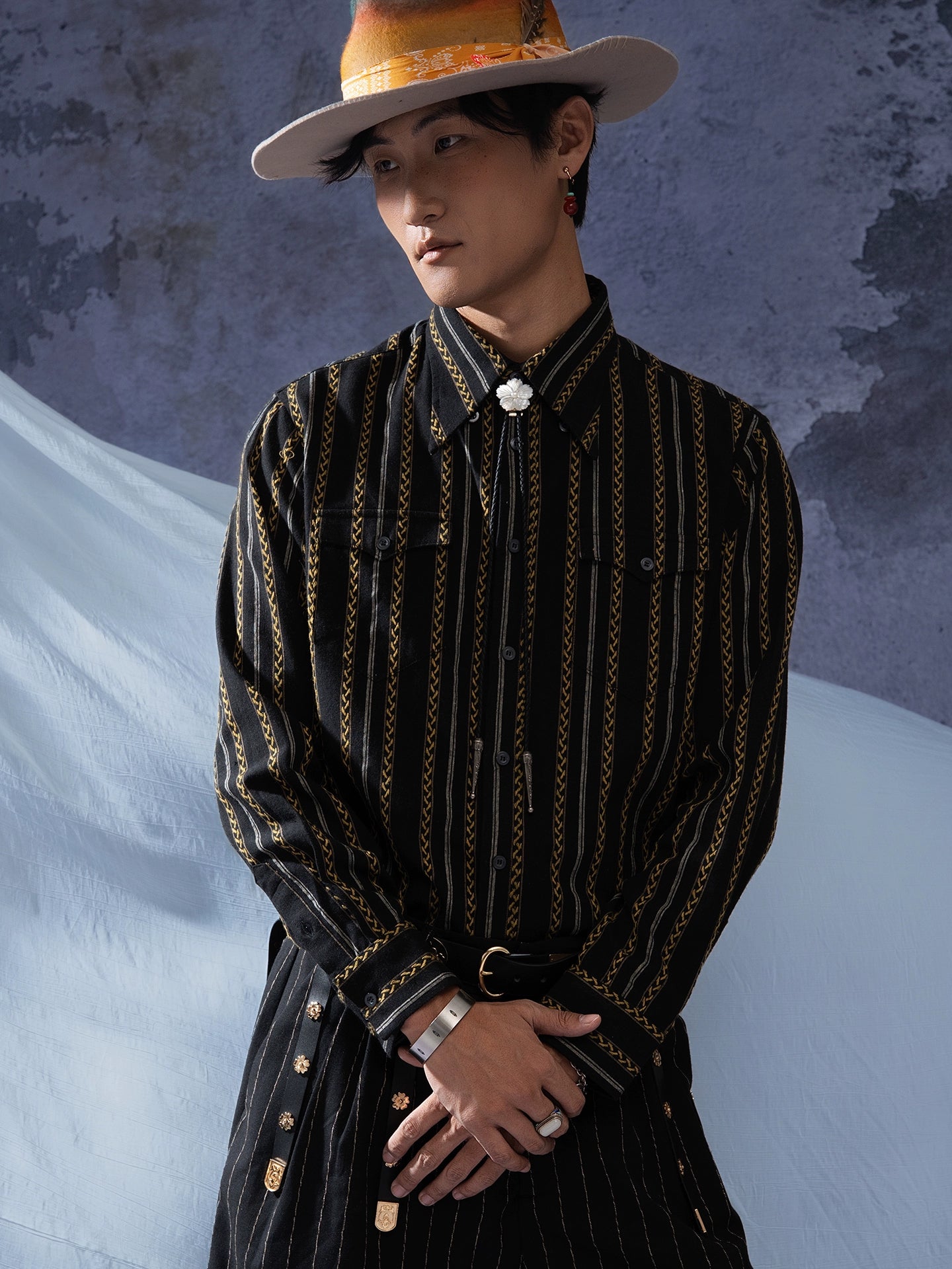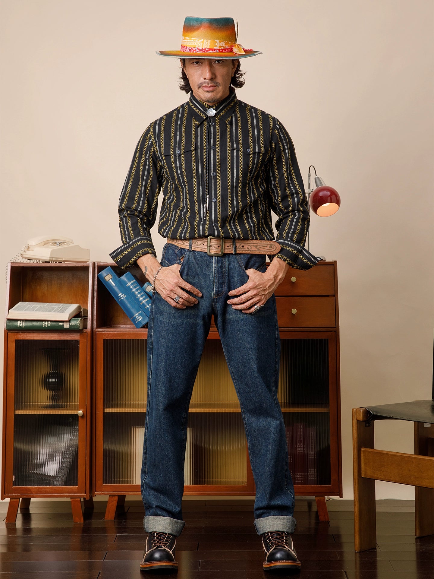 SOARIN美式西部牛仔风黑色条纹长袖衬衫男 全棉休闲提花工装衬衣