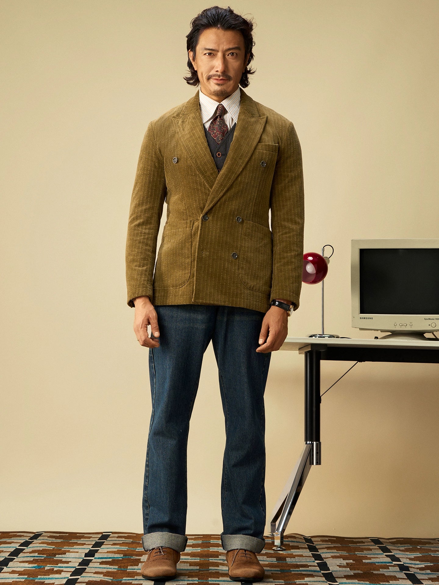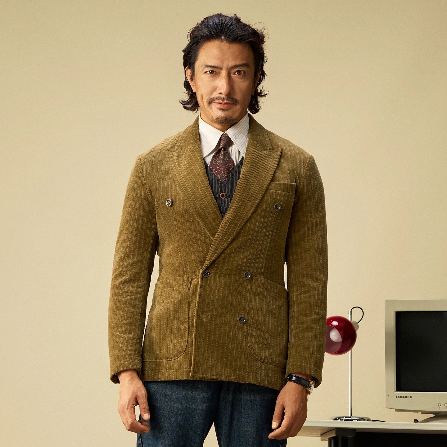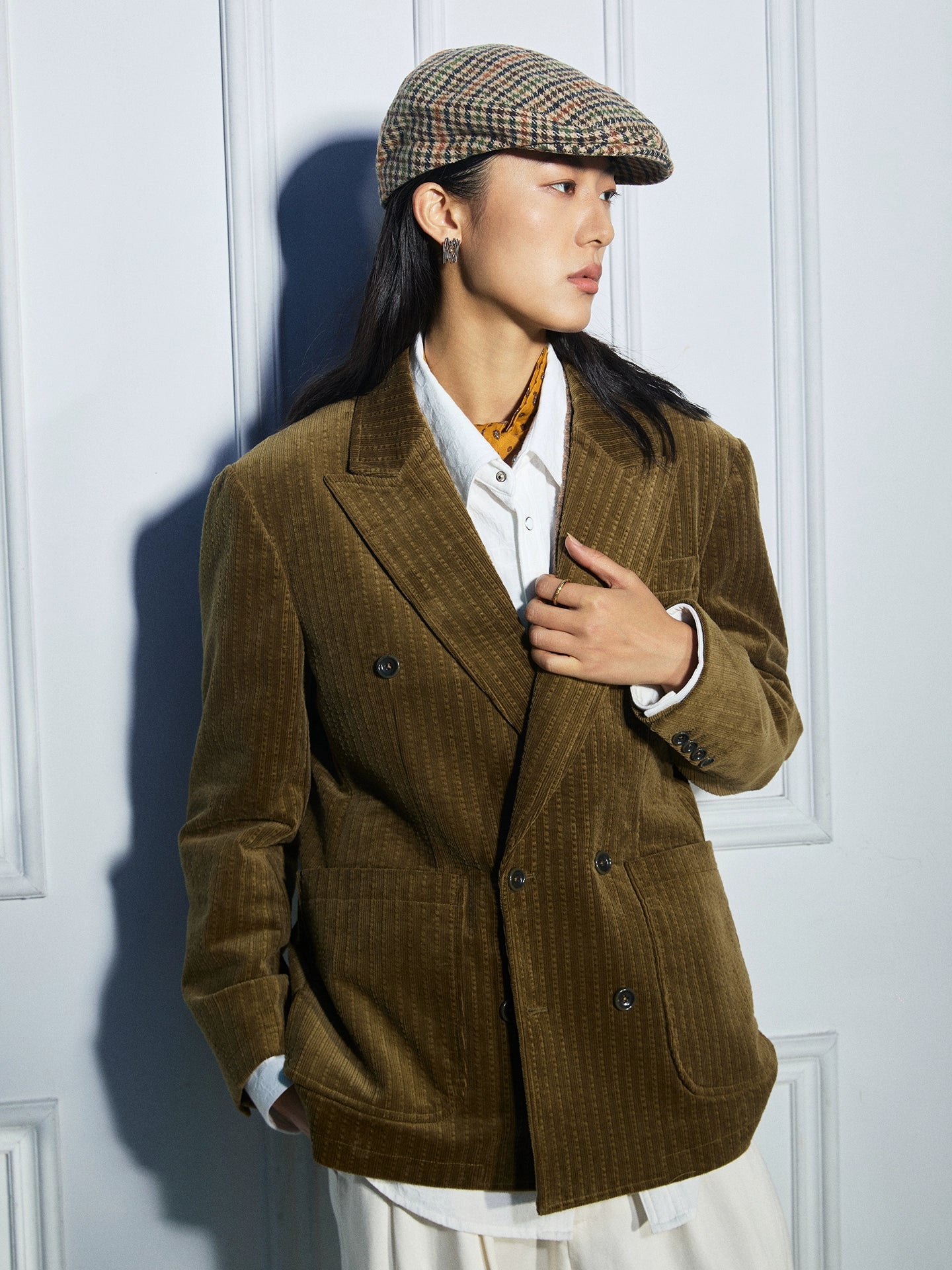 SOARIN英伦风复古灯芯绒西装外套男 老钱风双排扣条纹商务单西服