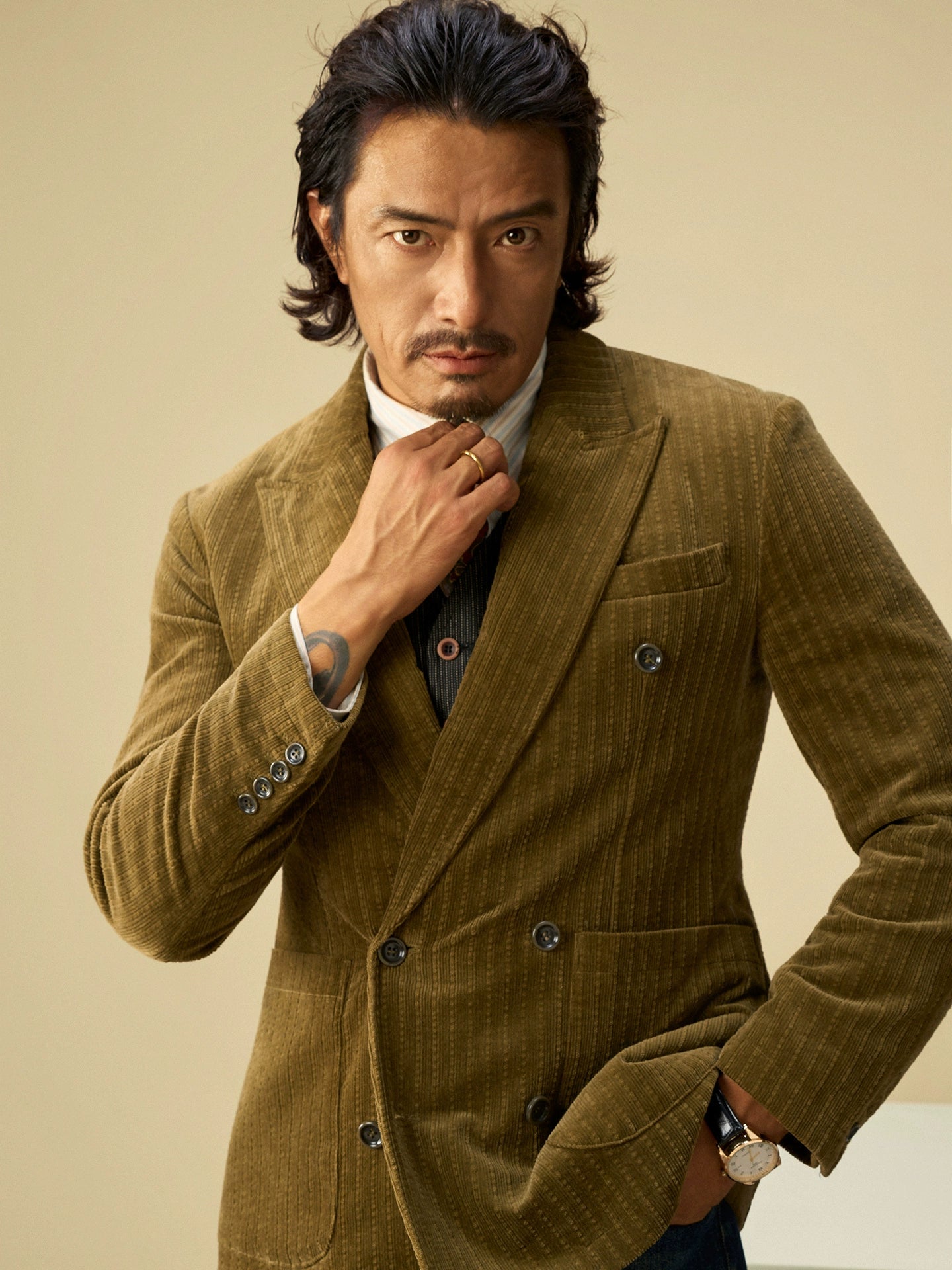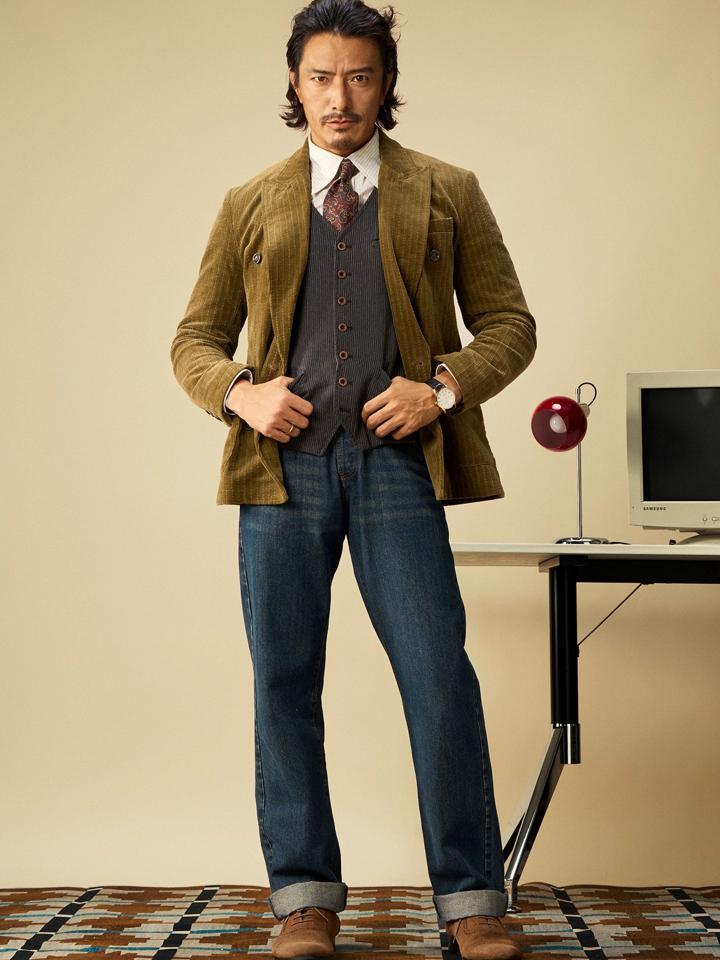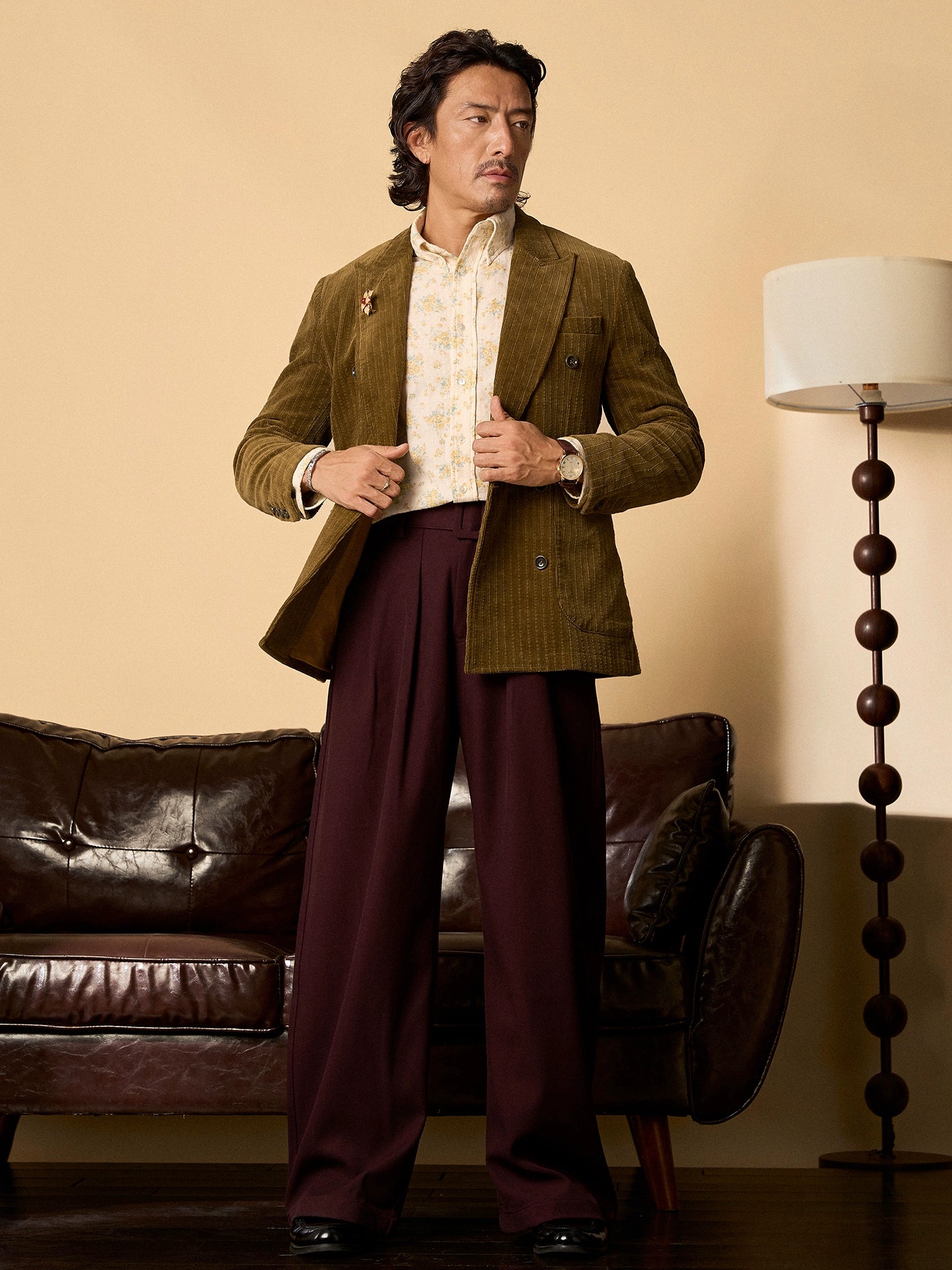 SOARIN英伦风复古灯芯绒西装外套男 老钱风双排扣条纹商务单西服