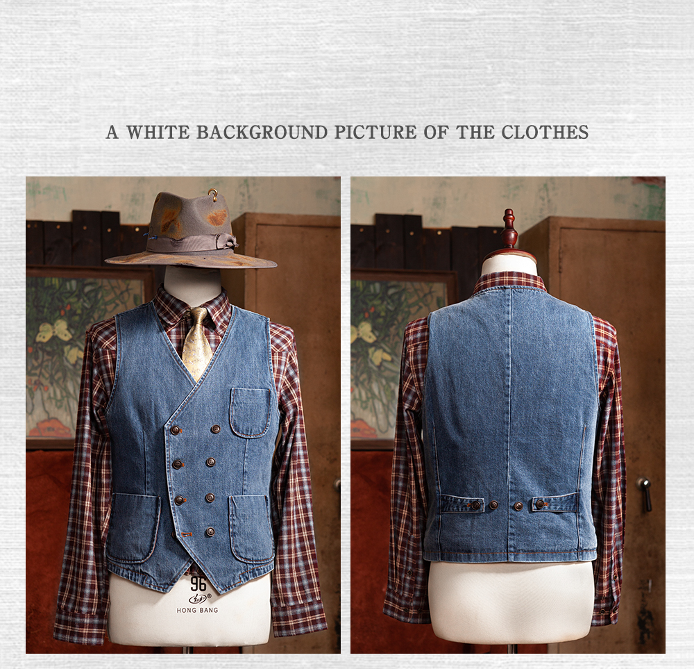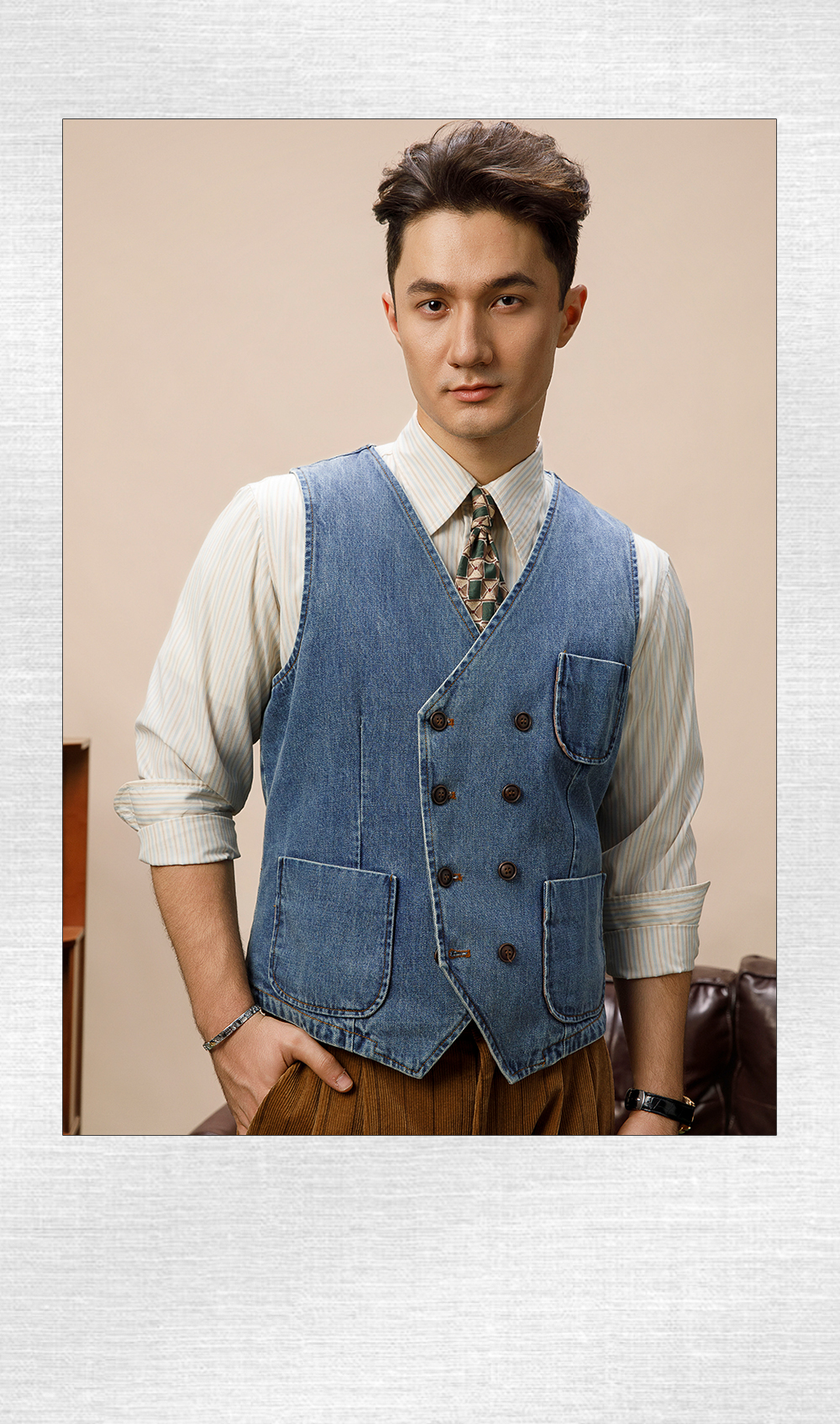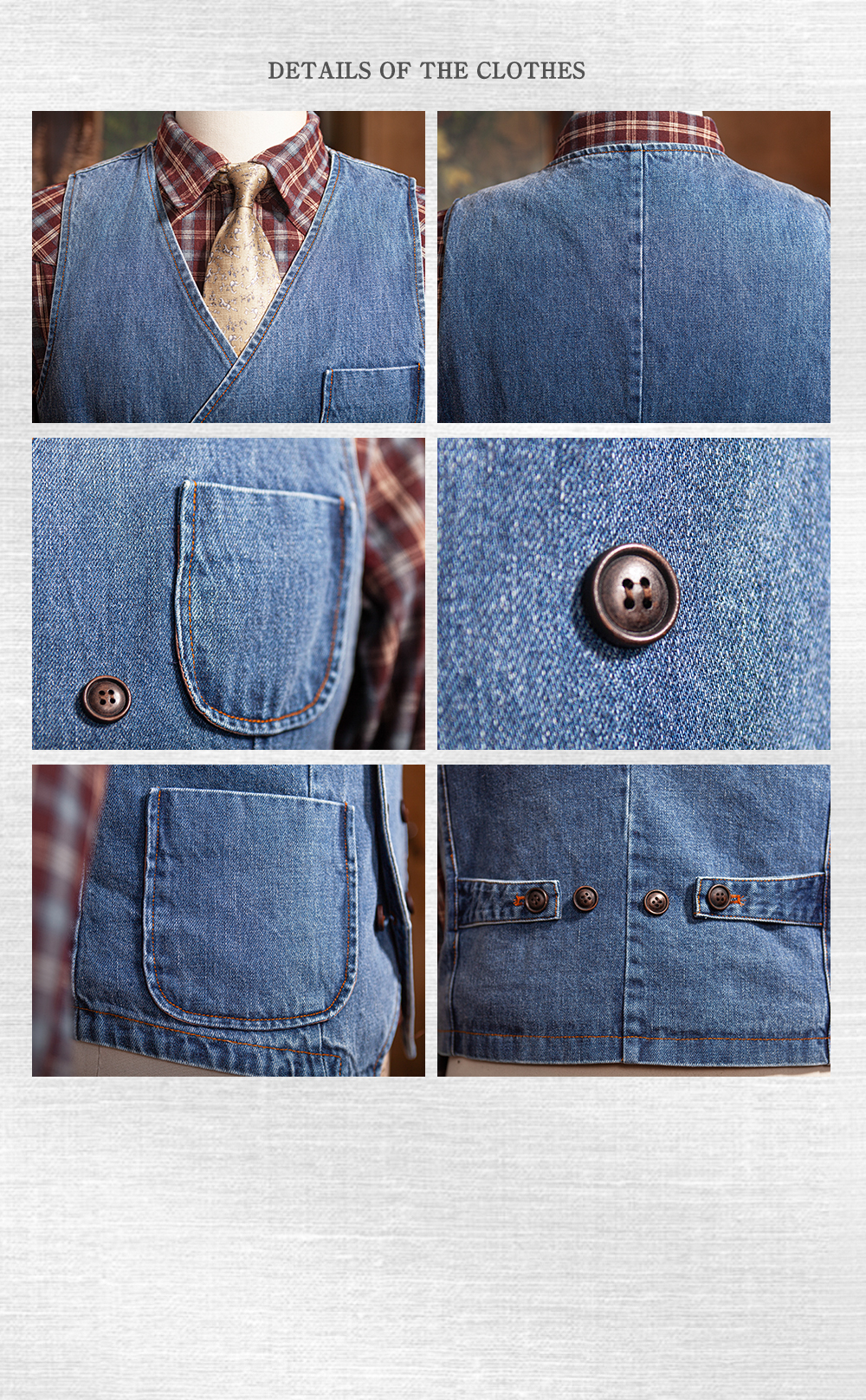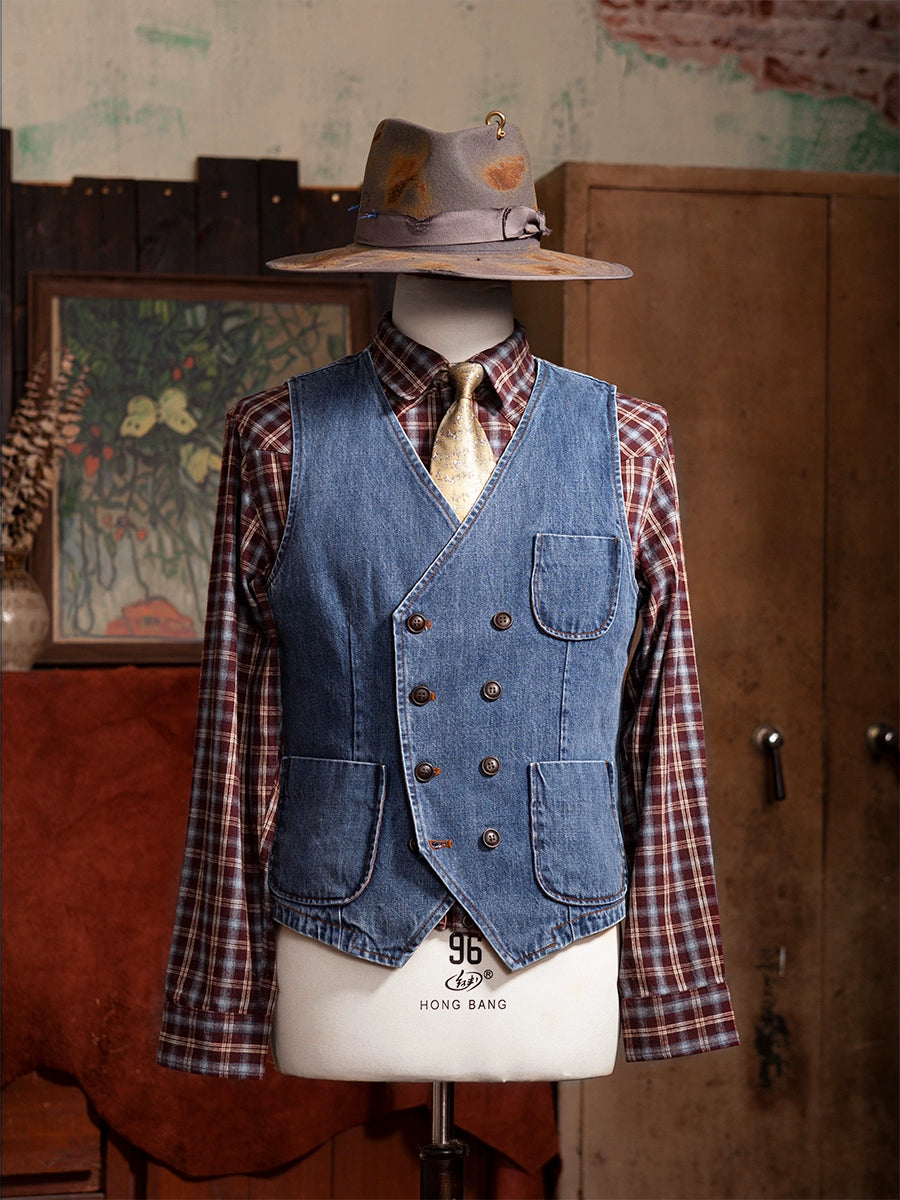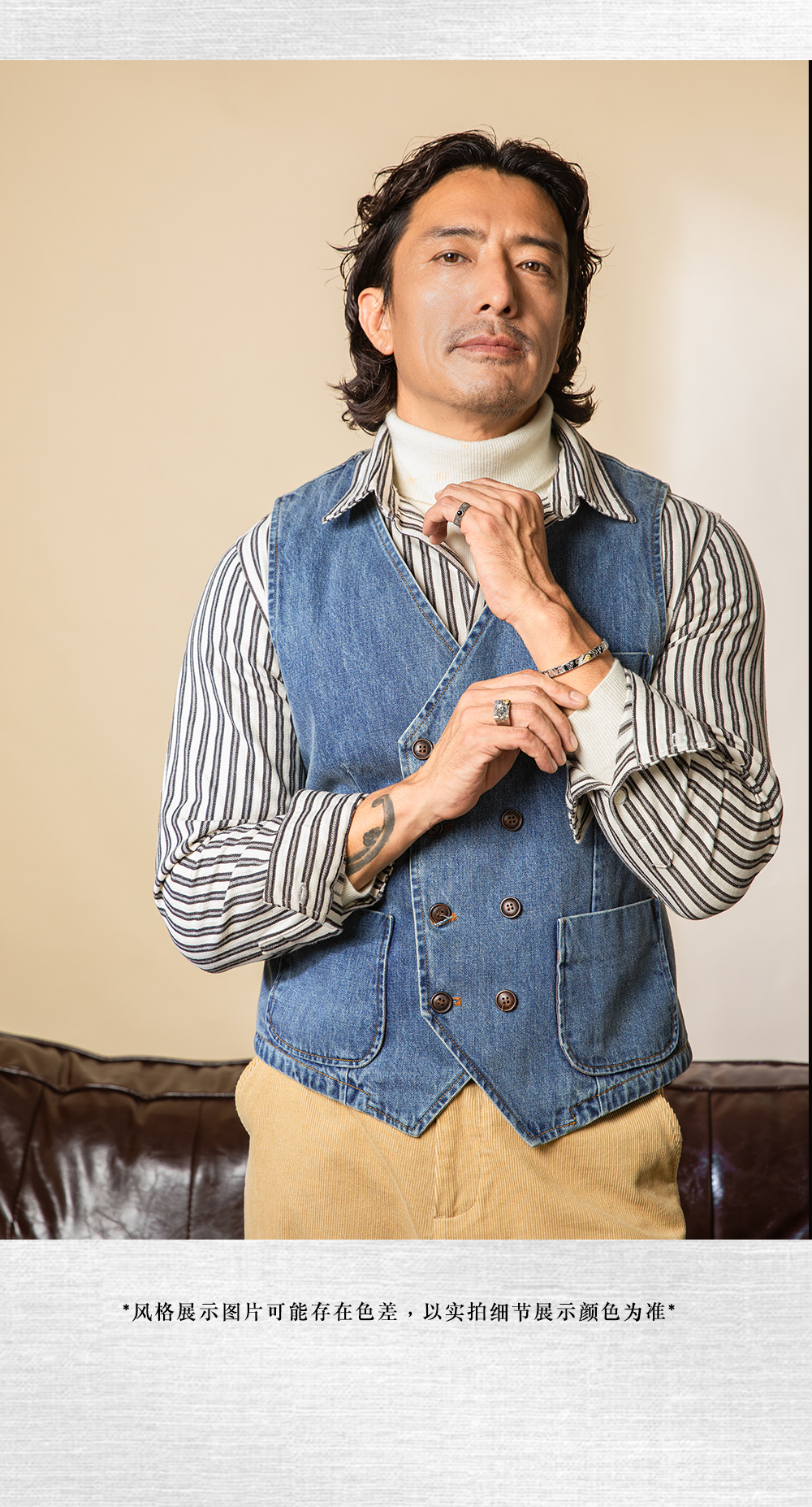 SOARIN英式复古水洗蓝牛仔马甲背心男 双排扣阿美咔叽休闲小马夹