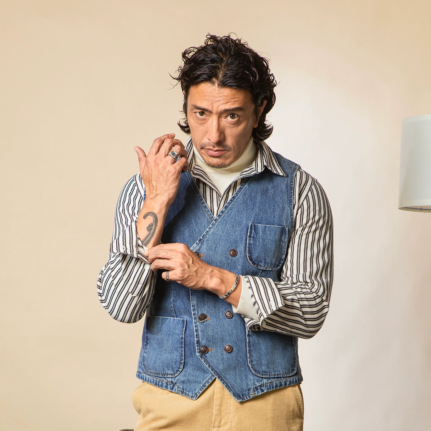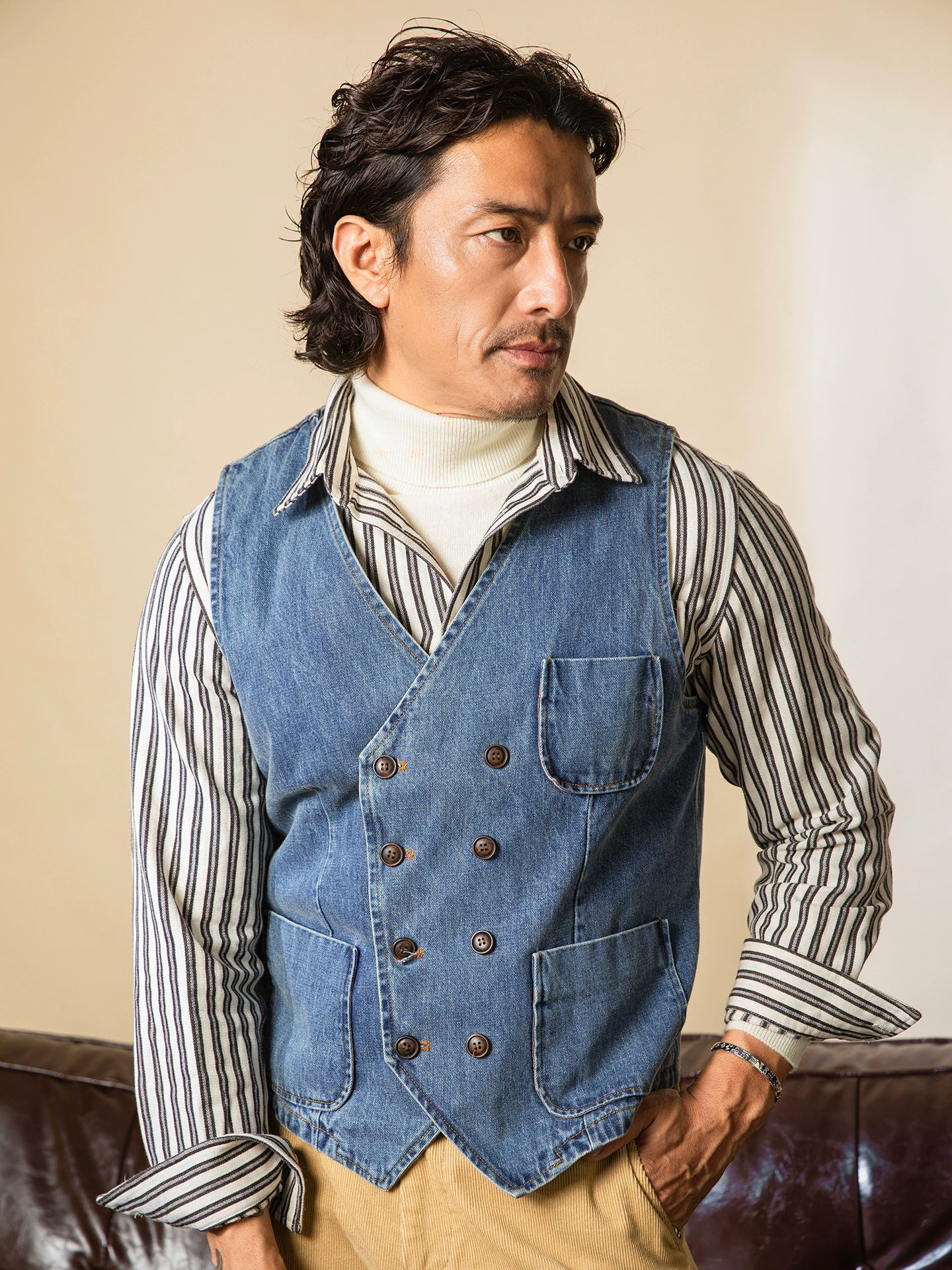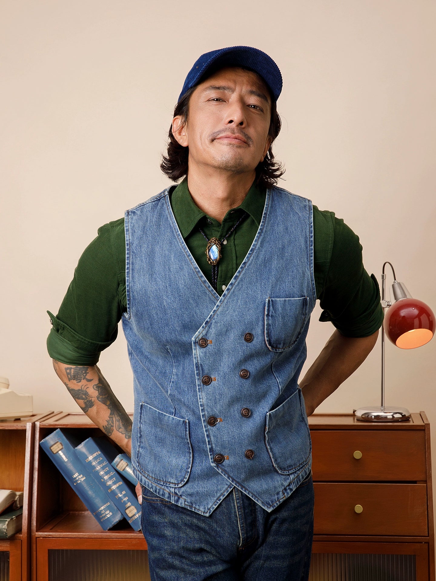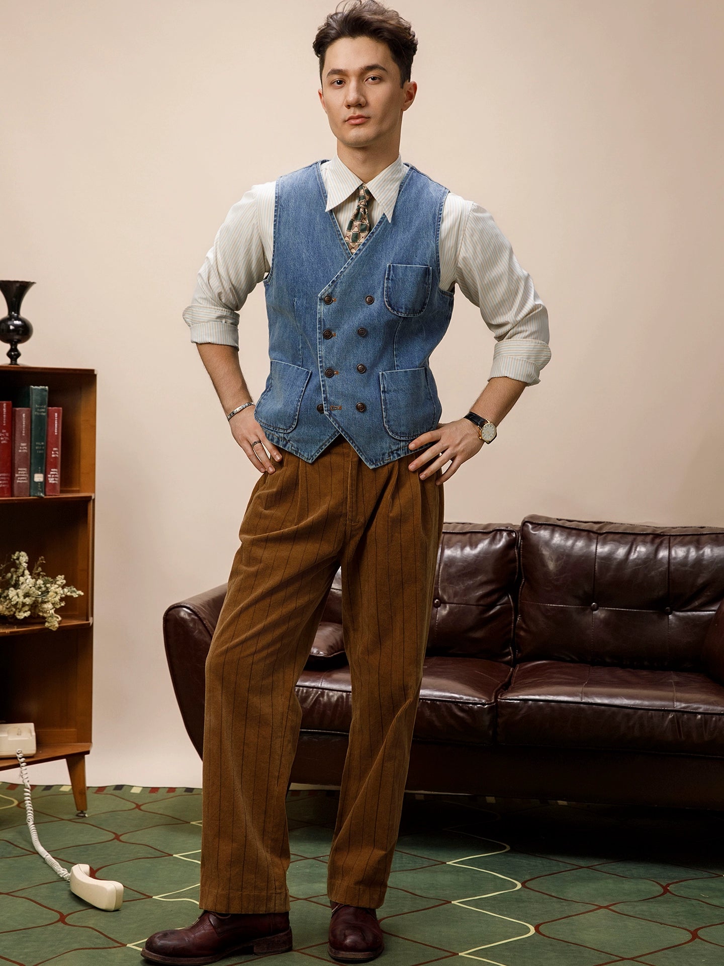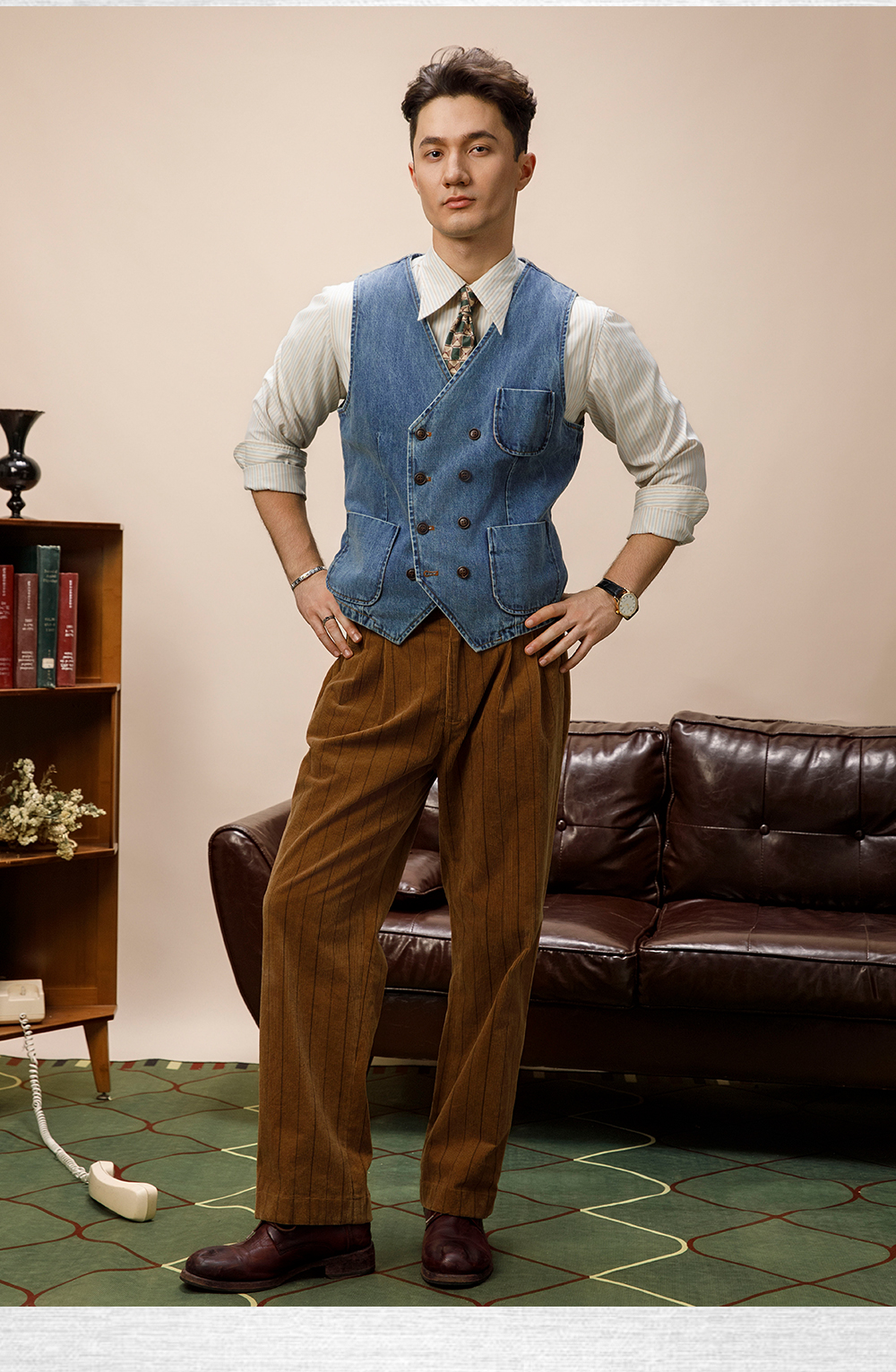 SOARIN英式复古水洗蓝牛仔马甲背心男 双排扣阿美咔叽休闲小马夹