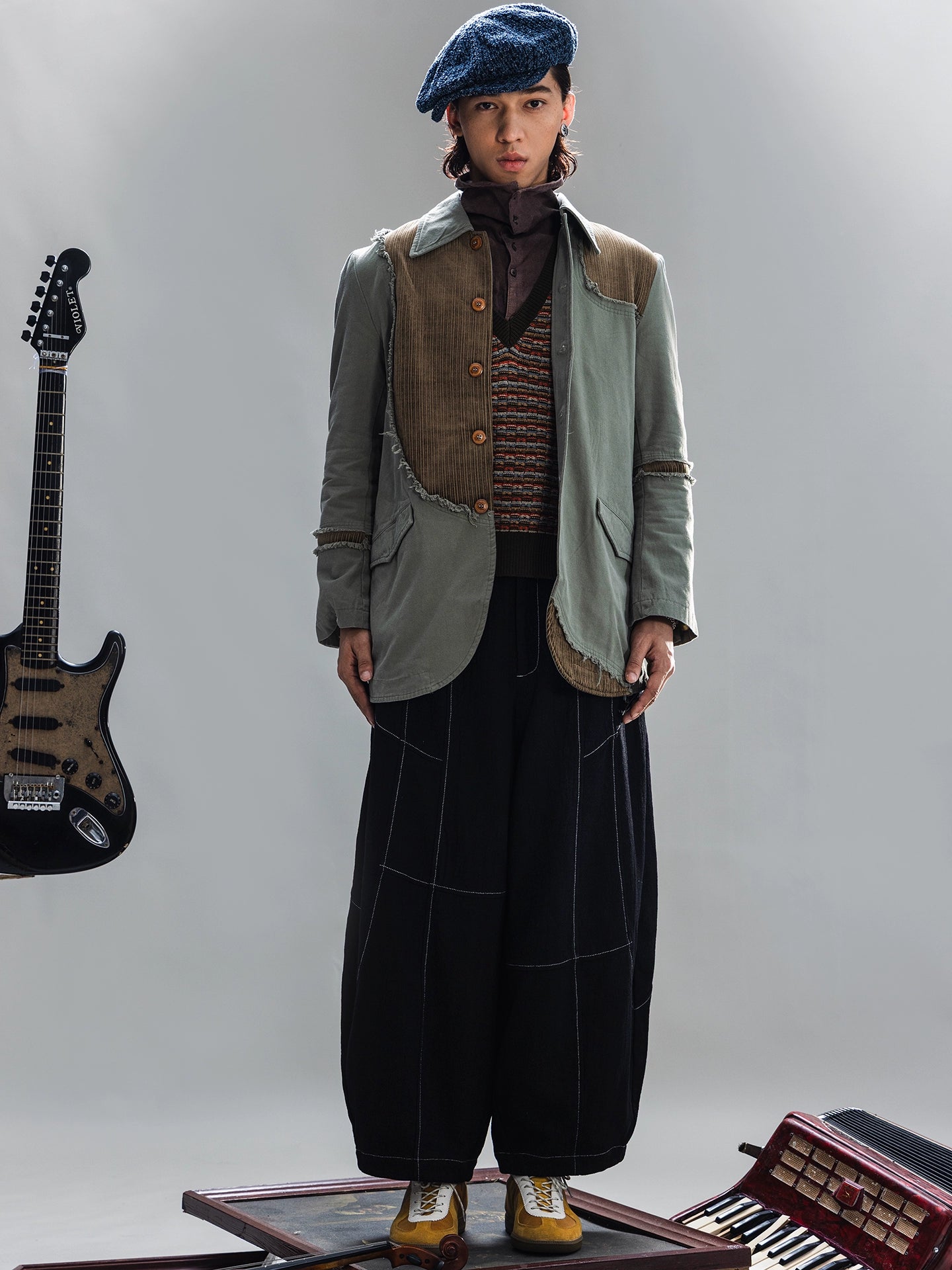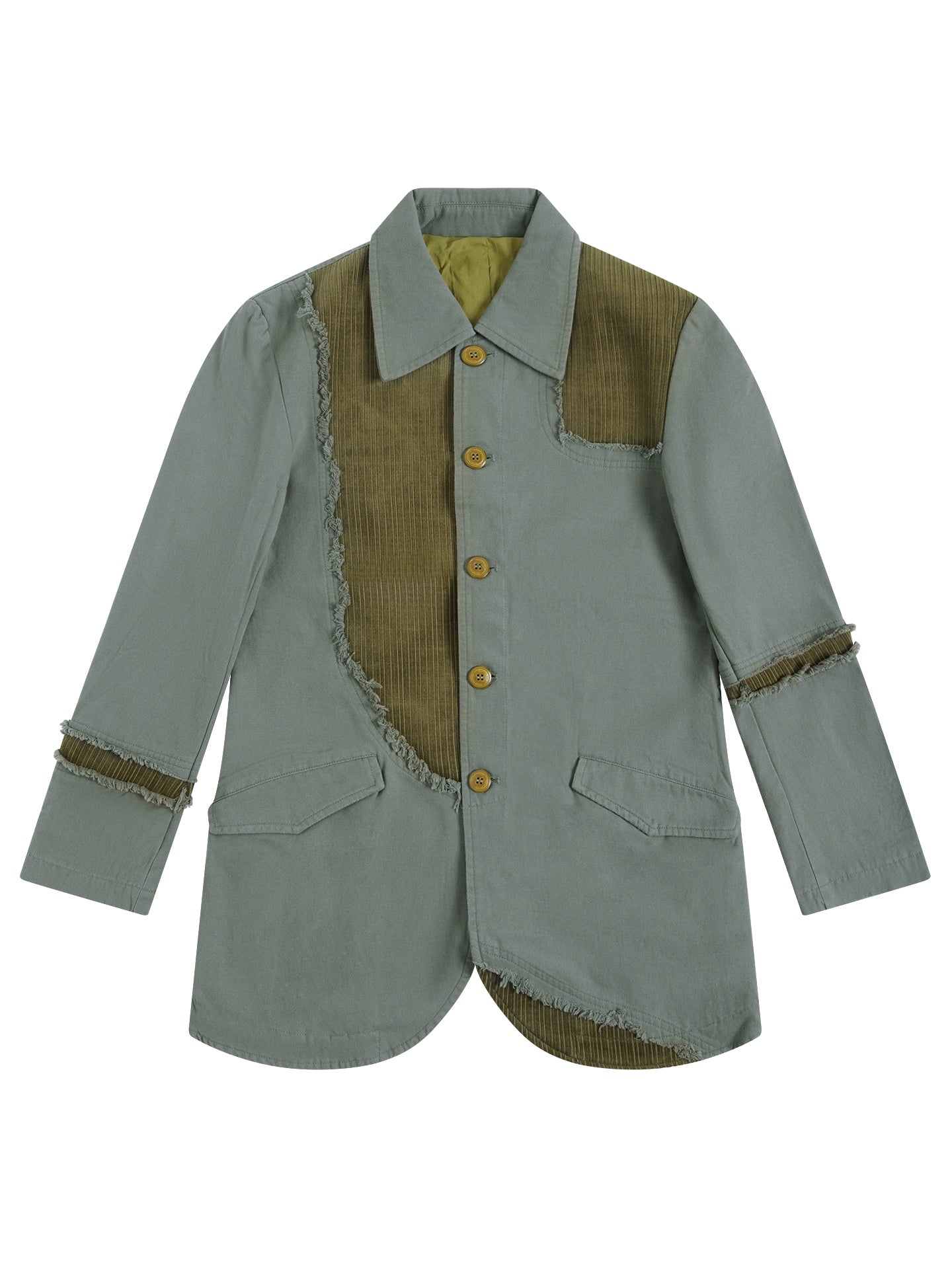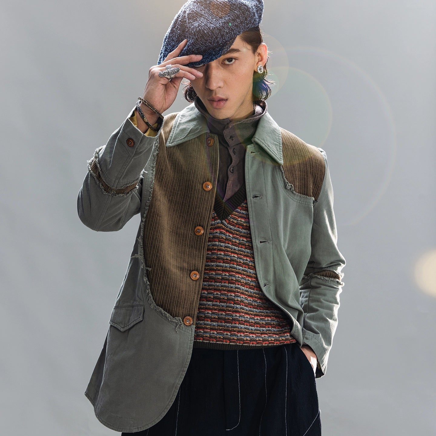 SOARIN【解构设计】独立复古拼接西装外套男不规则毛边长款单西服